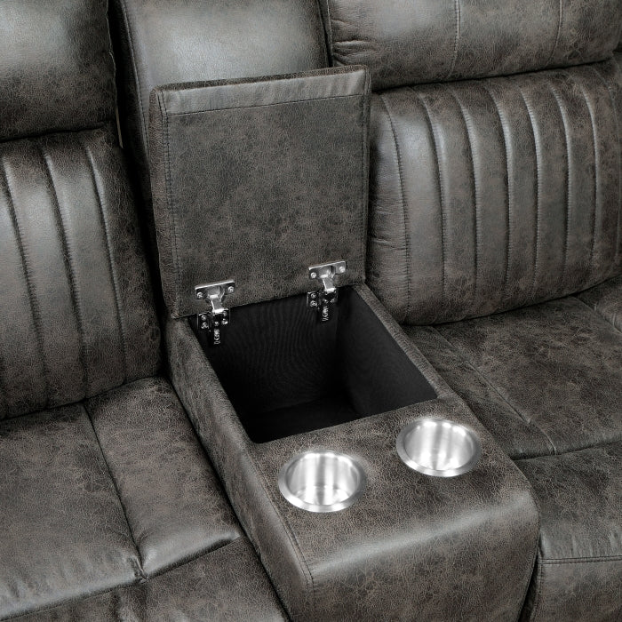 The design of the Centeroak Collection provides a platform for your relaxing downtime. From the classic transitional style to the versatile neutral color of the brown-ish gray faux suede fabric covering, this collection is the perfect addition to your living room. Plush seating features vertical tufting, pillow-top arms, each enhanced by the dual end recliners of the sectional. Creating additional function is the console unit providing secure placement of beverages and lift top hidden storage. The reclining mechanisms of the end recliners are engaged by a pull of the side mounted tabs, taking you from seated to prone in an easy motion.
