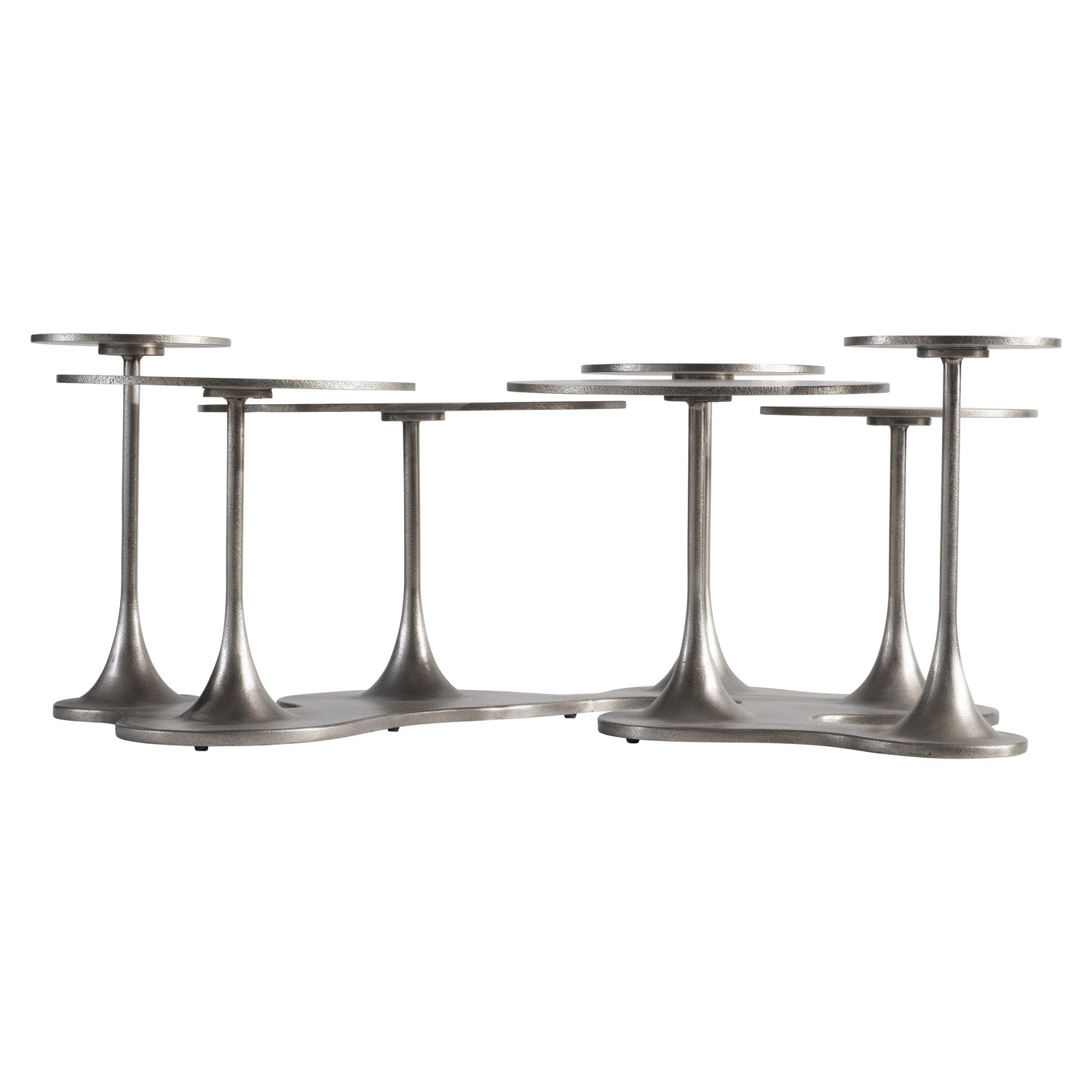 The Cerchi Graphite Outdoor Cocktail Table is an outdoor cocktail table constructed from cast aluminum that provides a functional surface with artistic design for outdoor spaces. This piece offers modern styling with a sculptural, organic design featuring shape and movement. A protective cover is available for an additional charge.