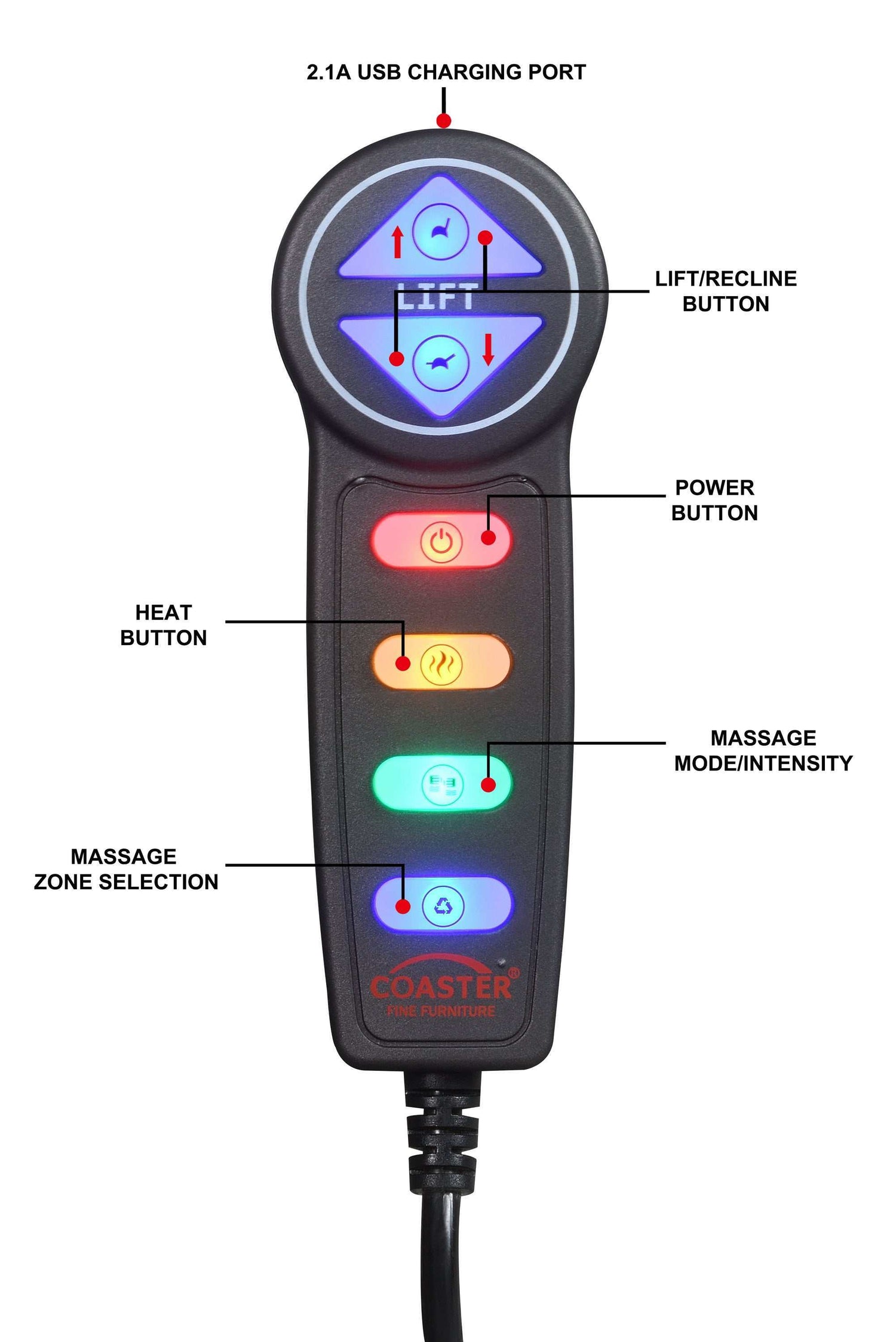 - Remote includes a 2.1A USB charging port