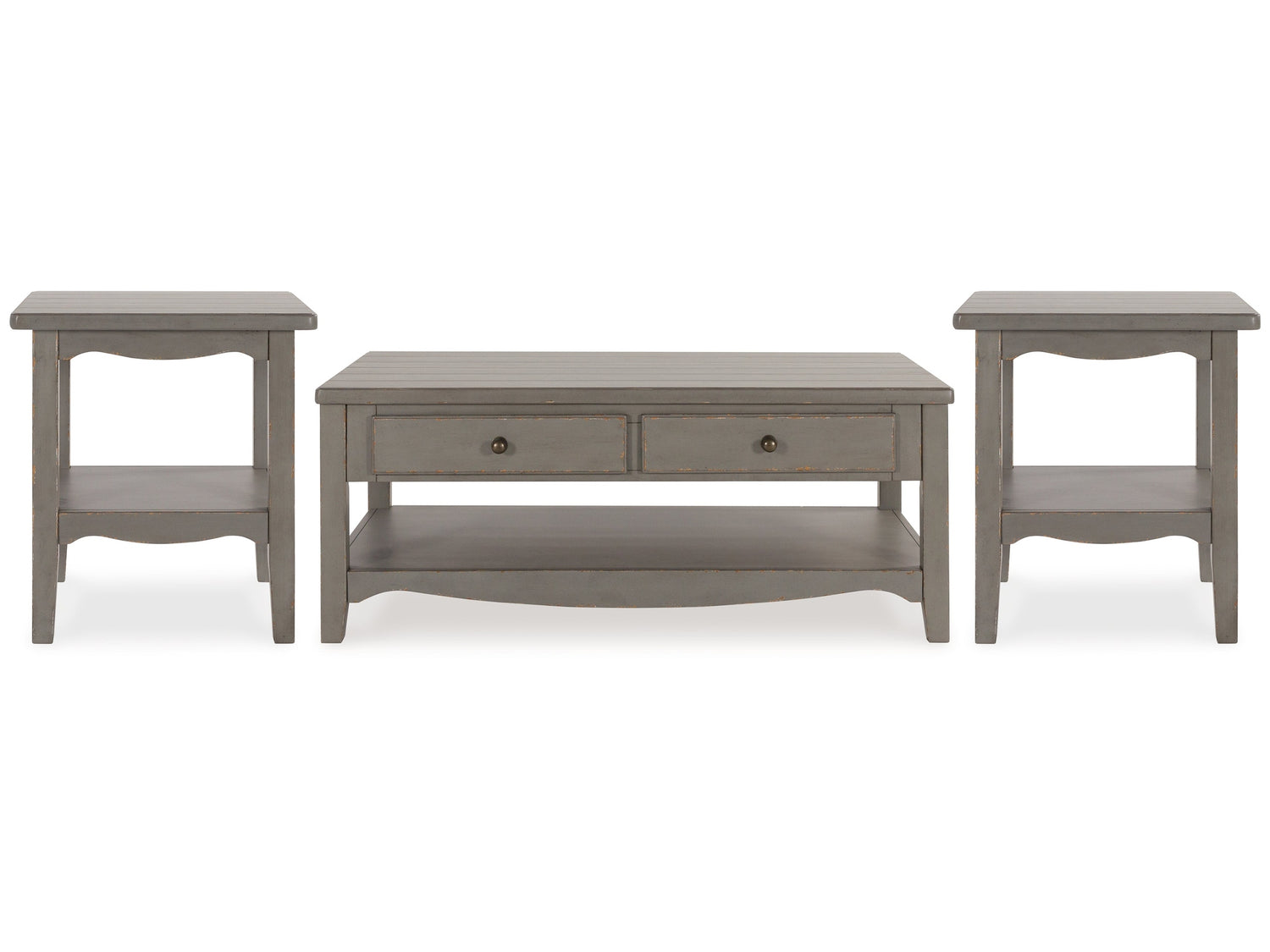 Put your love of European farmhouse styling on display. Finished with an antiqued gray chipped paint effect for an authentic vintage look, this coffee table is loaded with character. Two drawers and an open display shelf allow for storage and easy access to books, beverages and more. 2 Matching end tables included.