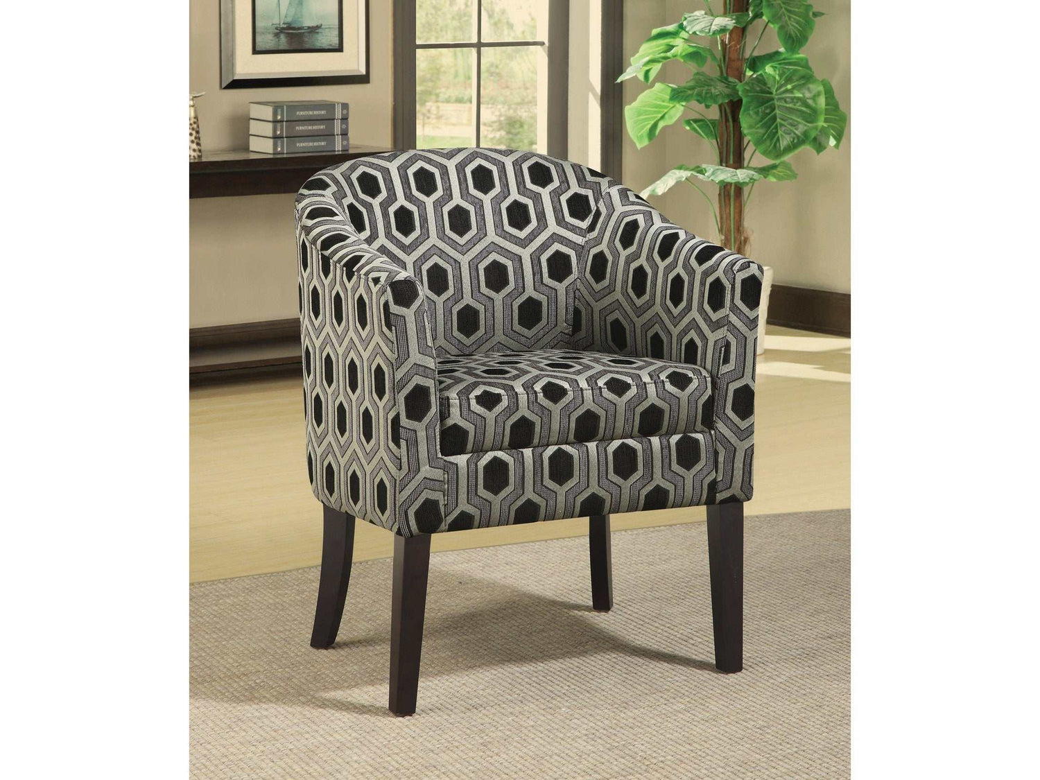 Pull out the retro design blueprint and add this accent chair to the mix. A busy print in grey and white dazzles within a monotone or colorful blend of surrounding furnishings. Retro in style, its barrel back silhouette speaks to the beloved look of mid-century. Skinny tapered legs with a cappuccino finish provide an enticing coordinating feature. This chair makes its mark in a transitional family or living room.
