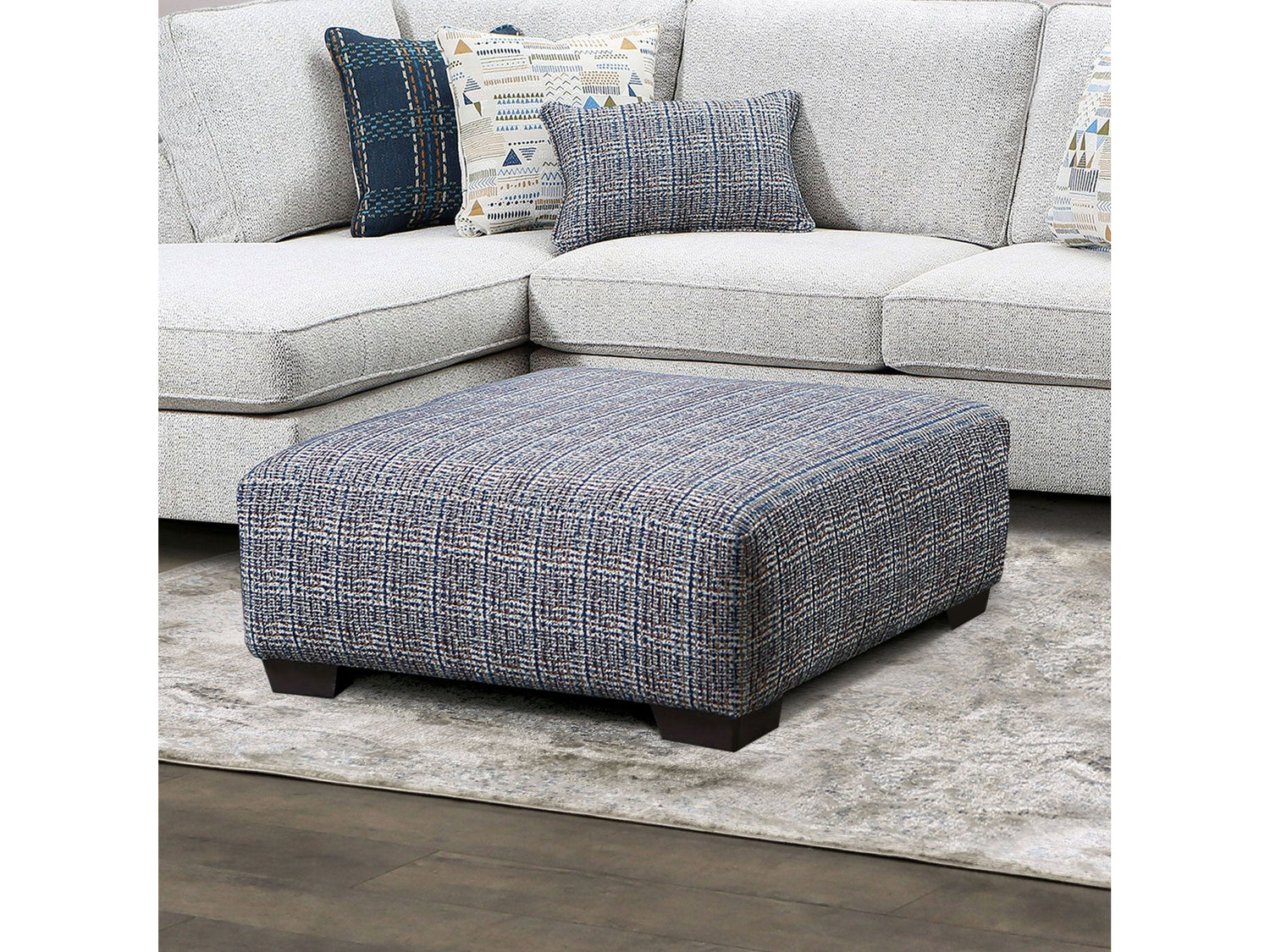 For those looking for extra seating and a statement piece, this ottoman is the perfect choice with its chenille fabric with a unique multidimensional pattern in a cool shade of blue. The soft fabric and generous size provide a comfy oasis for you to rest your tired legs on after a long work day.