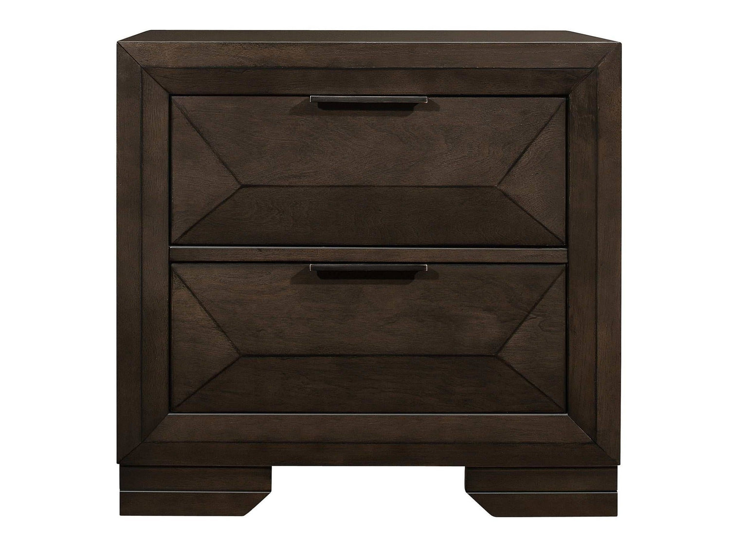Contemporary design and convenient functionality intersect in the design of the Chesky Collection. Birch veneer is finished in a warm espresso on this unique nightstand. Raised panels provide visual interest to the drawer fronts of the nightstand. Complementing horizontal metal hardware lends an additional accent to the piece.
