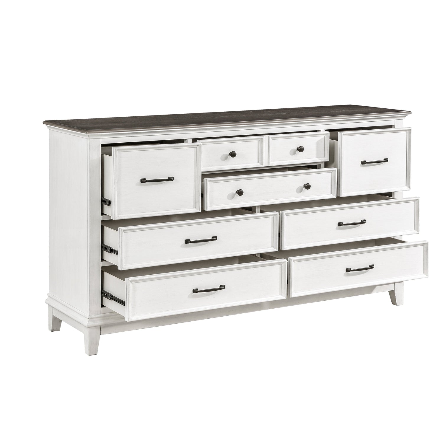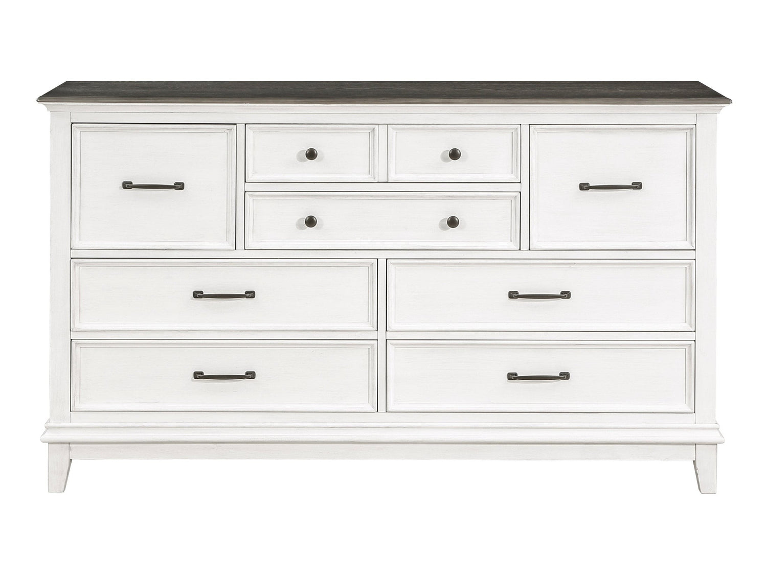 Exuding the aesthetic of casual country living, the Chesterton Collection’s classic lines create a look that perfectly captures your preference for farmhouse design. The two-tone finish of the collection is a warm contrast of dark brown and antique white. The knob and bar hardware that fronts the drawers of the dresser provide distinct complementing contrast to the collection’s finish.