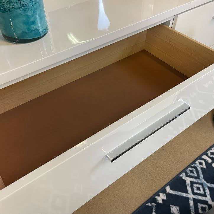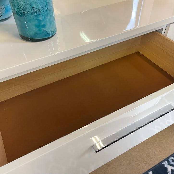 Take your bedroom to the next level with this modern dresser. The high gloss white finish brightens any setting. The dresser add a touch of chrome to the high gloss finishes to break up the shapes without compromising on modern sensibilities.