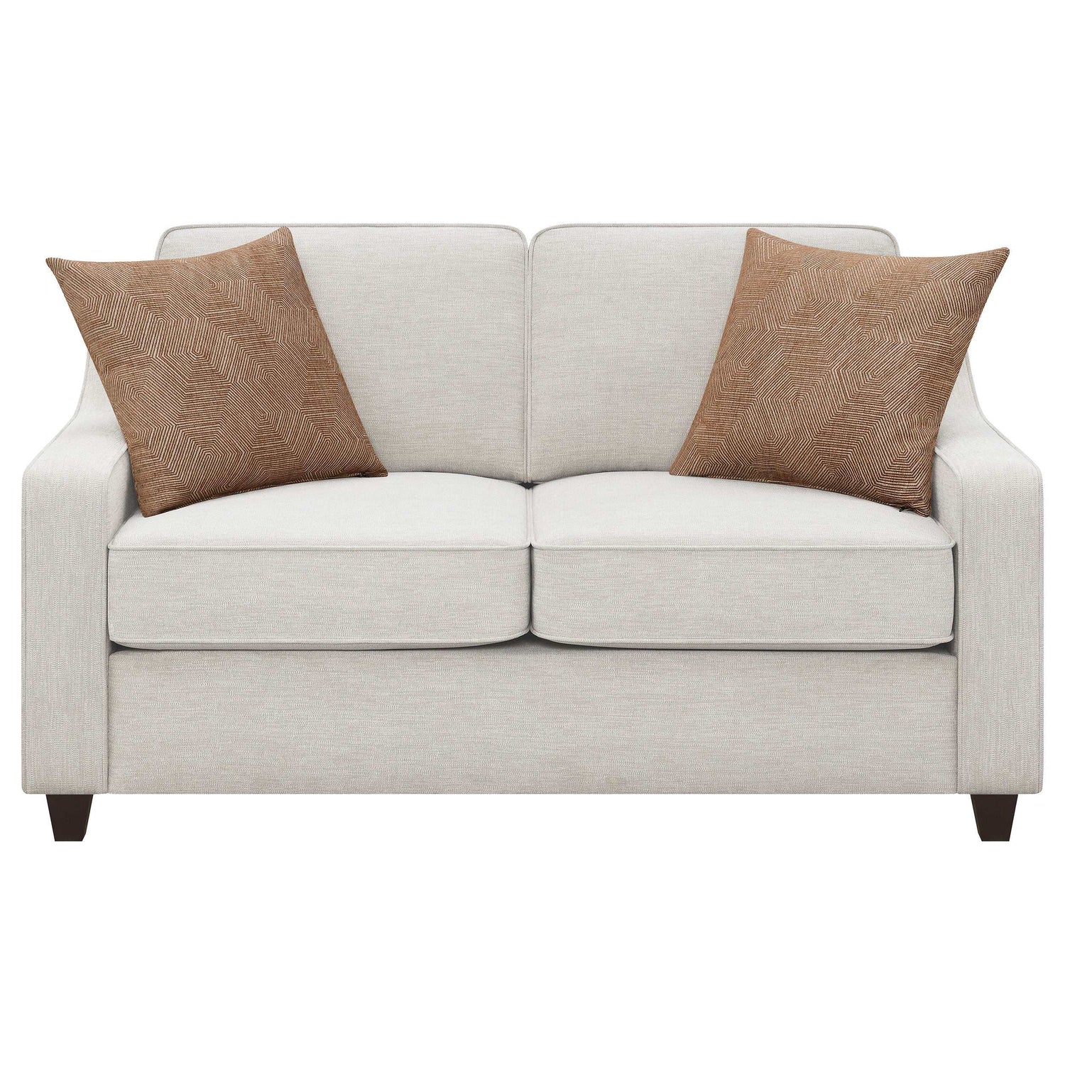 Wrapped in a cheerful, beige woven chenille upholstery, this seating set exudes a look of sophistication. Sloped track arms add elegant lines while tapered dark brown legs add a striking contrast. Understated yet regal, this transitional seating set works inside farmhouse and contemporary style homes effortlessly. Dense and plush boxed seat and back cushions feature classic welt details, as coral and copper tone accent pillows lend a boho-like tough. Add this upholstered furniture set into a space for a subtle chic aesthetic.
