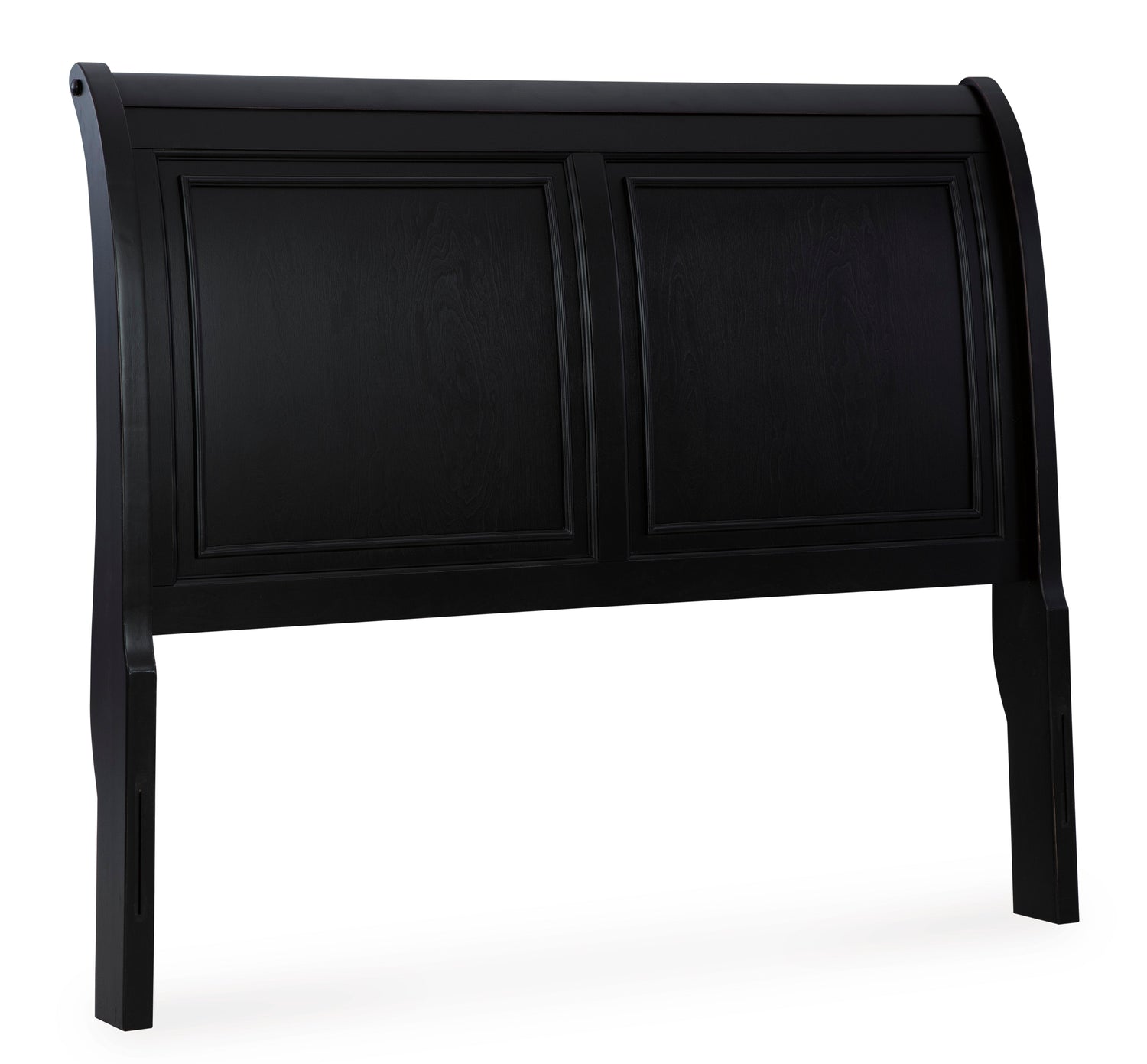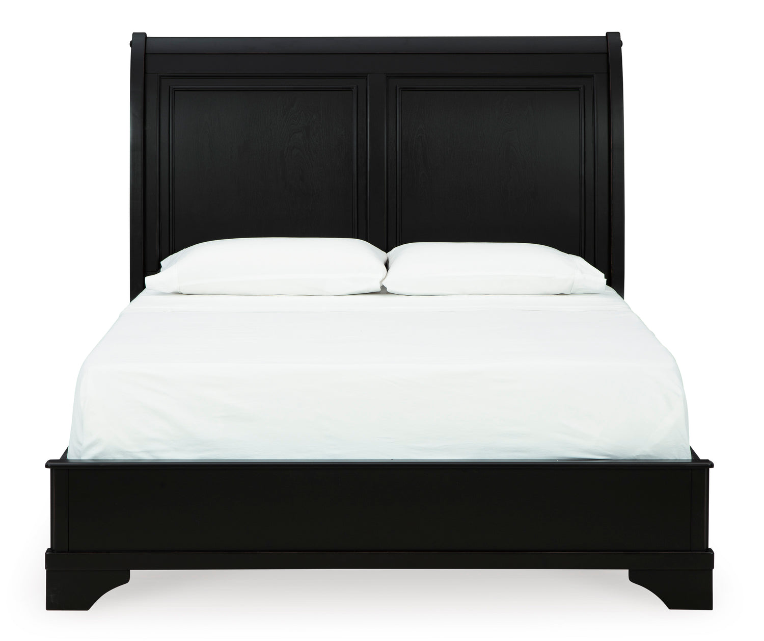 This queen sleigh bed has a timeless look and traditional design that dresses up your bedroom. Its black finish adds a casual aesthetic, while the sleigh headboard with double-framed panels is offset by a low-profile footboard.
