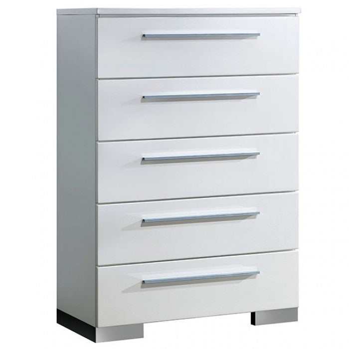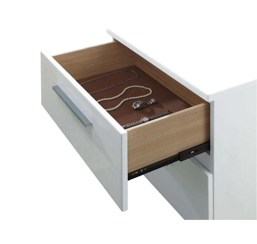 Furnish your bedroom with this stylish bedroom collection for a contemporary look. Taking glam styles into consideration, these pieces are clean-cut and awe-inspiring. This set features a smooth white finish with attached chrome legs that resonate with the style of modern decor. To amp up the appeal, the button tufted leatherette headboard offers LED light paneling along the frame to create a stylish setting.
