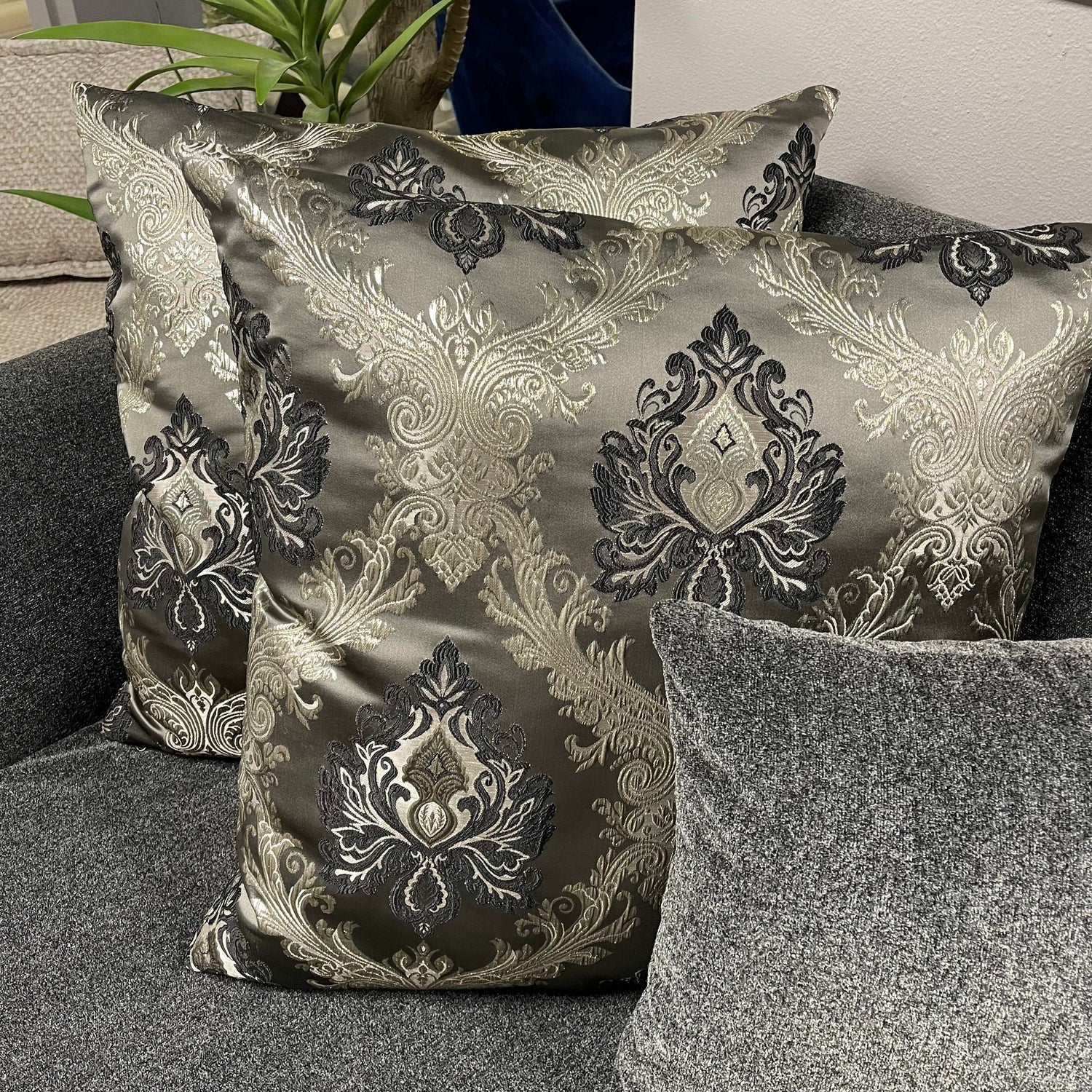 A stylish combination of lustrous dark gray chenille and wood, this living room set is a truly dynamic take on an already classic design. Coupled with multiple elements emphasizing the traditional motif--rolled arms, faux wood frame carvings, and cabriole legs. And even though the larger pillows feature conservative patterns in keeping up with the style, a subtle hint of modern can be found on the smaller, shiny throw pillows.
