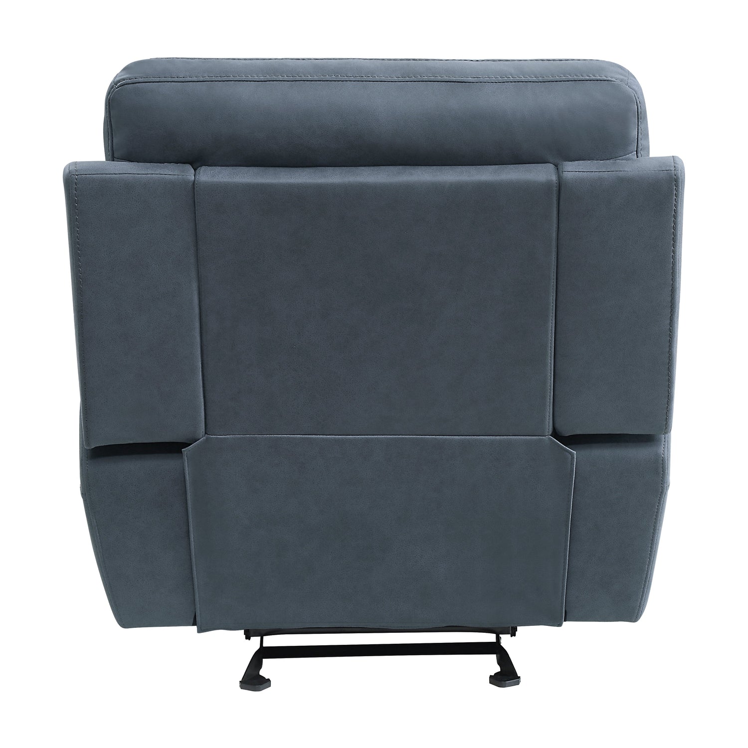 The modern profile of the Clifton Collection serves to provide comfort, function and style to your home’s casual living room. The blue polished microfiber that covers the plush arms and seating of the chair lends to the decorative versatility of the collection. The glider reclining chair features a manual motion mechanism operating with the pull of a side-mounted tab, that once engaged, take you from seated to reclined in an easy motion.