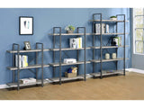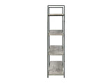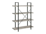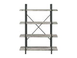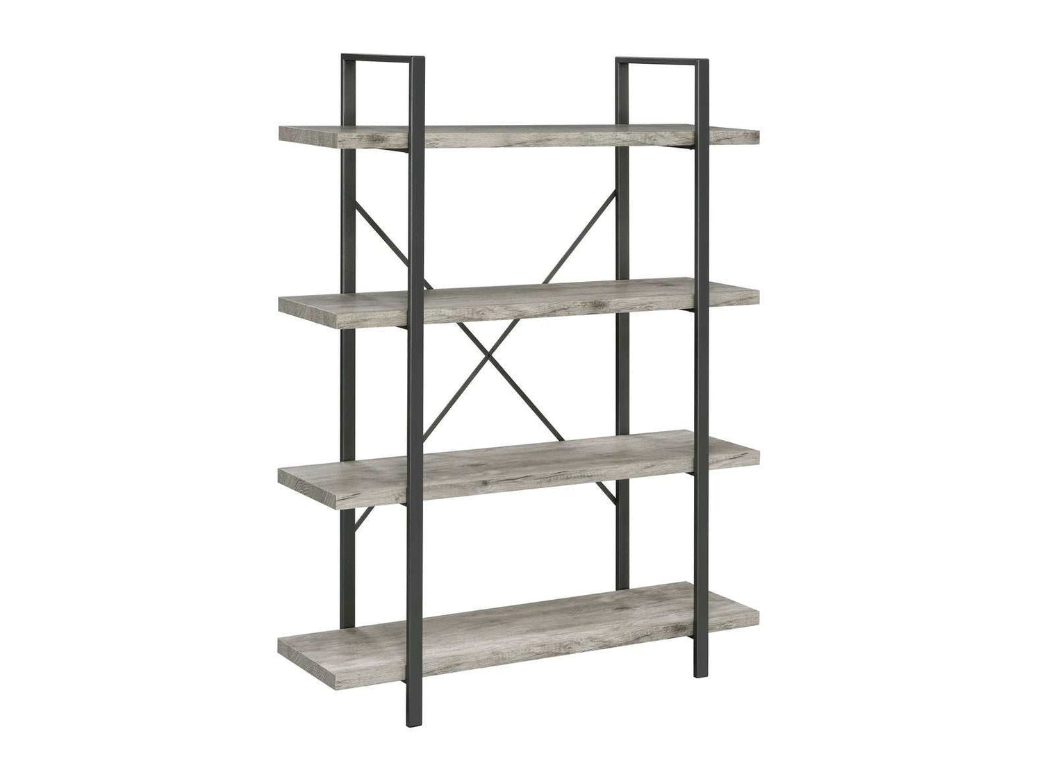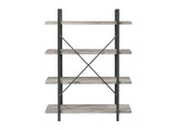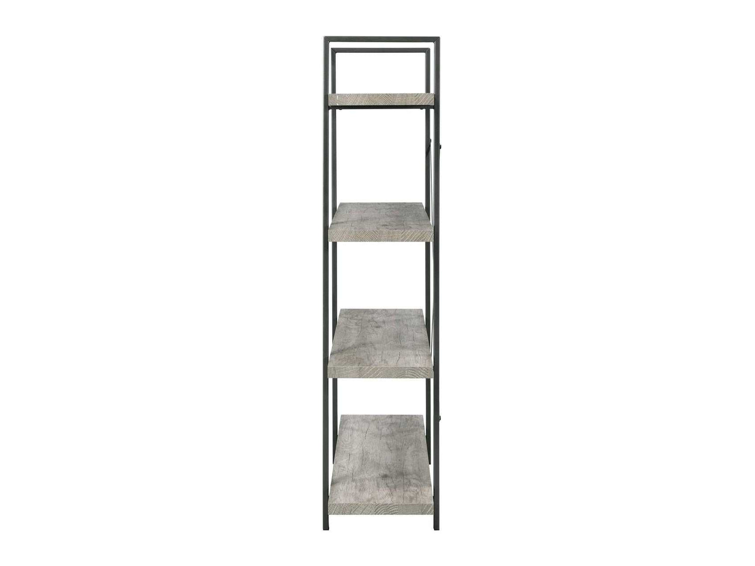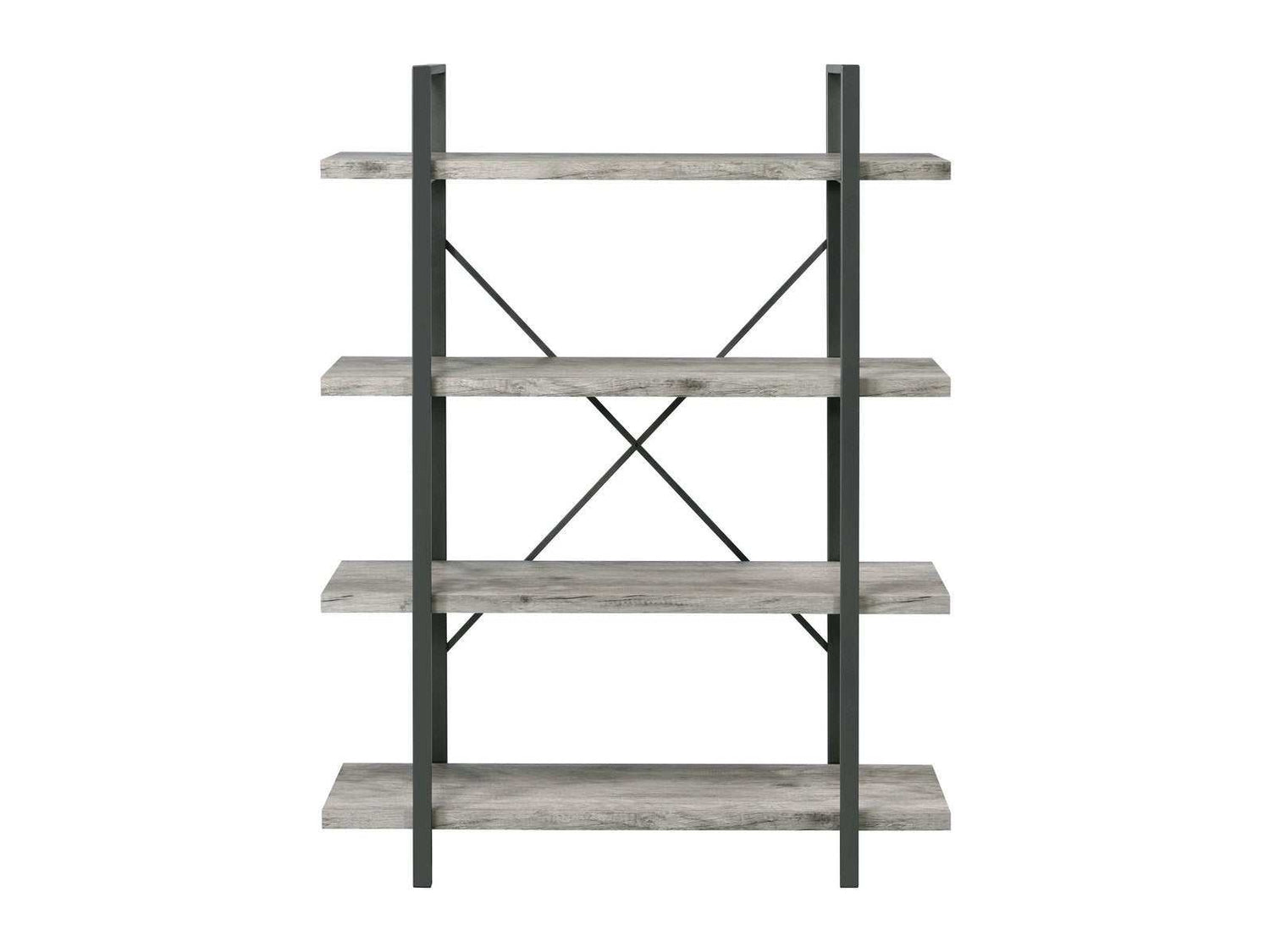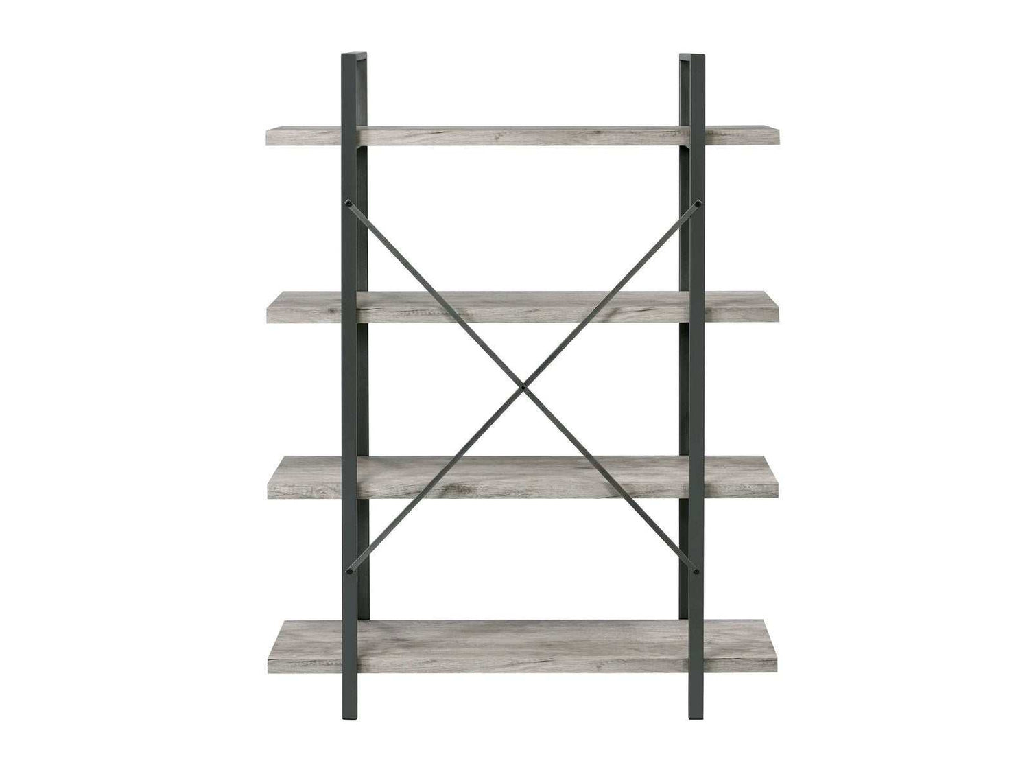 This perfectly rustic style bookcase will soon improve your living area or workspace. Four spacious shelves provide plenty of storage for your book collection. The durable geometric frame provides an open and airy display. The cross back design provides additional support and aesthetic flair. This four-shelf bookcase is constructed from materials such as steel and engineered veneer.