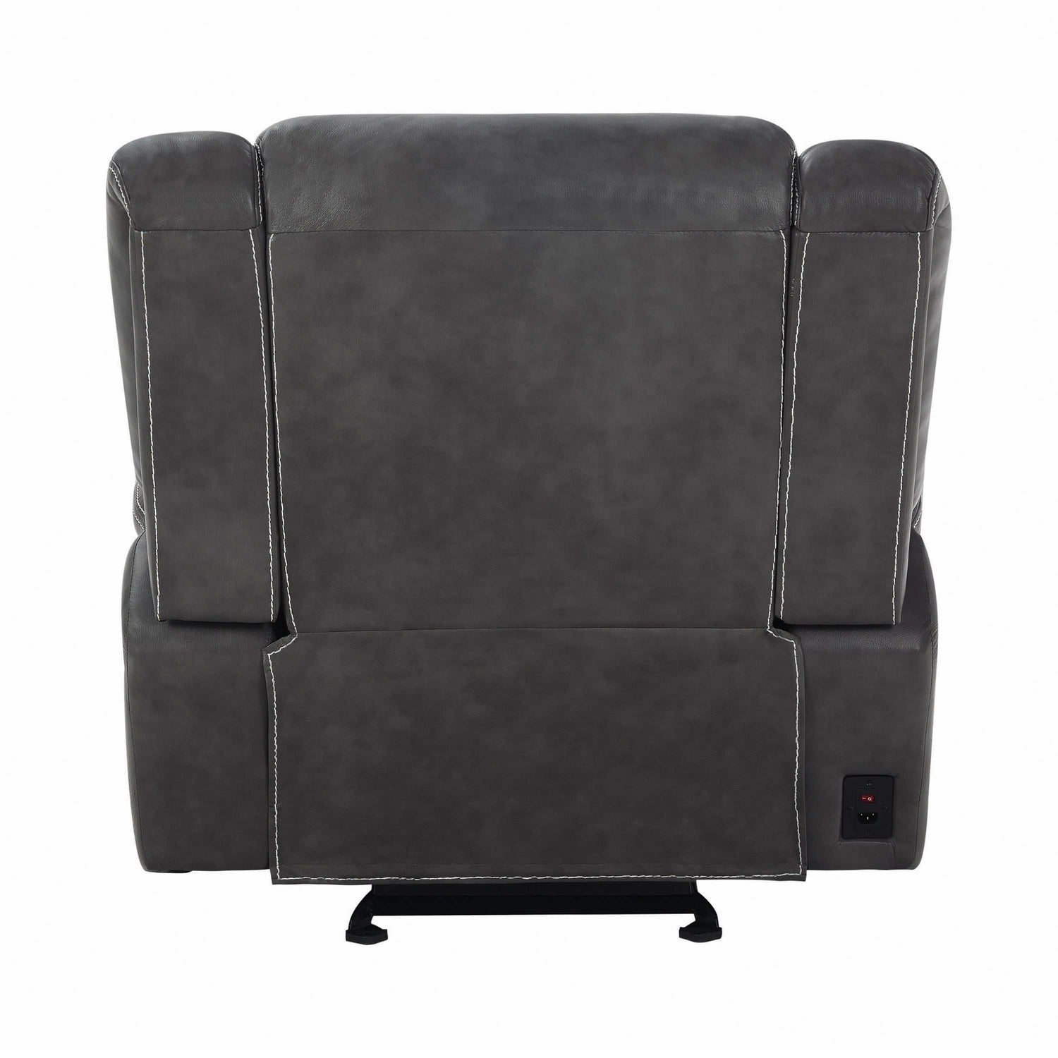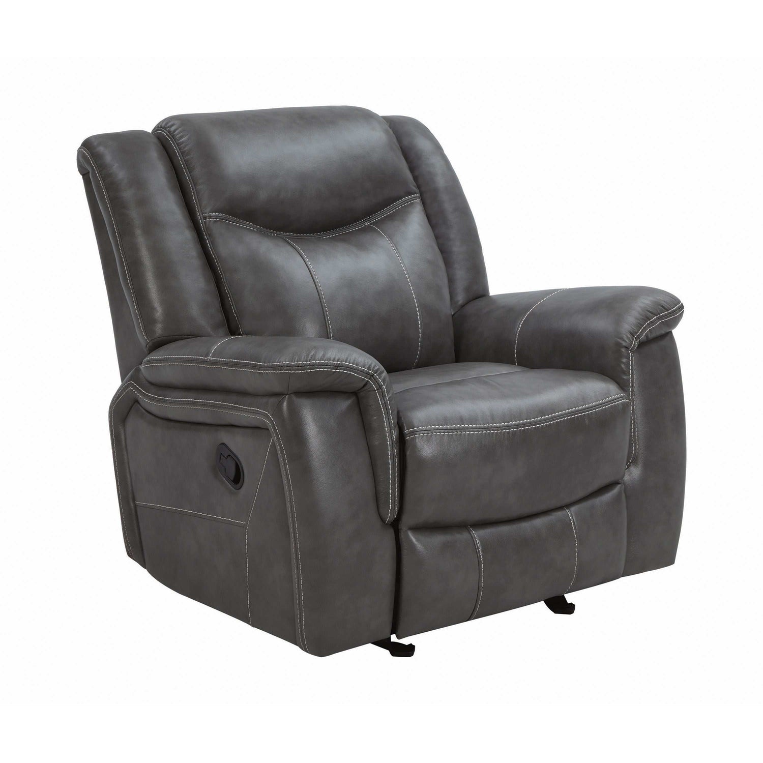 Grey is in and it looks no cooler than on this motion glider recliner. This indulgent recliner features a sumptuously padded headrest to lay your head in comfort. Both armrests and seat cushion are overstuffed for long-lasting comfort. Simple and ergonomic lever on the side provides quick and easy reclining. Luxuriously upholstered in cool grey leather-like material, this recliner is as contemporary as it is opulent.