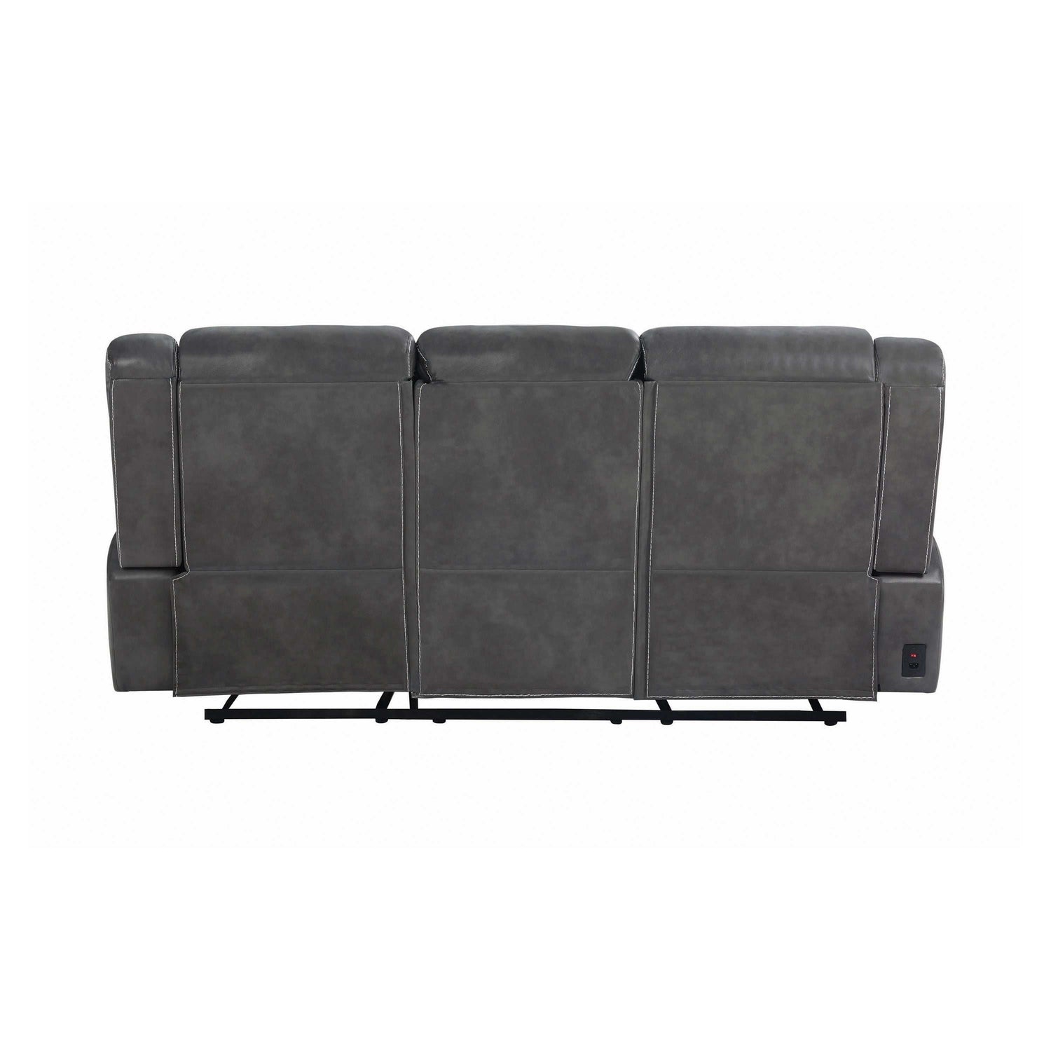 - Sofa features drop-down table with pop-up power outlet (2AC/2USB), two (2) cup holders, and storage drawer