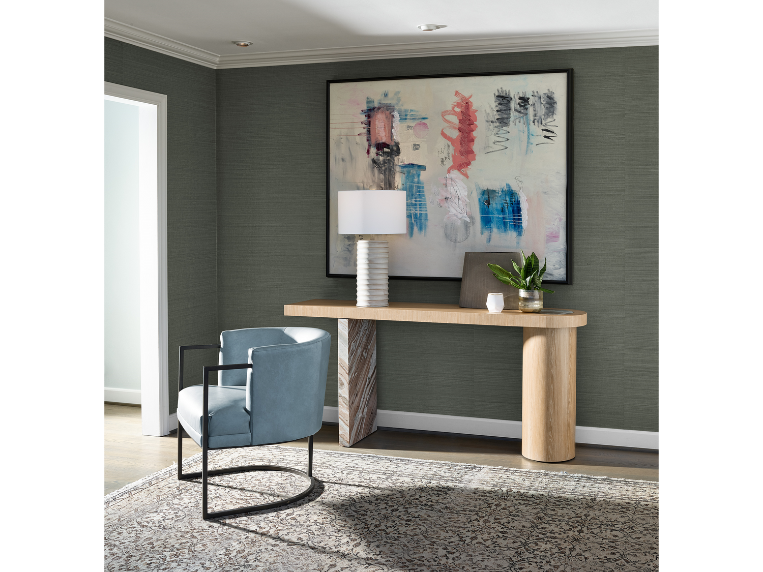 Imaginative and free-spirited, the Wood and Stone Console creatively marries an oak-finished silhouette with one marble pedestal leg offset by a petite marble tabletop accent.