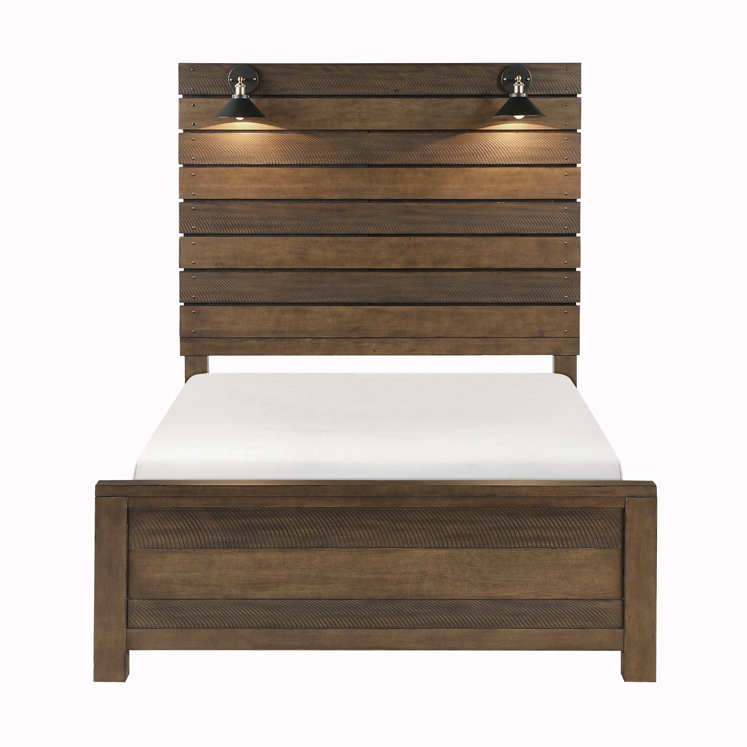 In a blend of transitional lines, industrial accenting and rustic textures, the design of the Conway Collection emerges, it’s bold look a complement to your home’s unique look. The antique brown finish over birch veneer of the rough-hewn boards, that comprise the slats of the collection, are worked into the design by lending to the profile and uniform horizontal lines of the bed. Mounted on the upper slat of the California King panel headboard are the LED lights with black and brass finished lampshades, each providing additional light sources within your bedroom and further lending to the rusticated aesthetic of the collection.