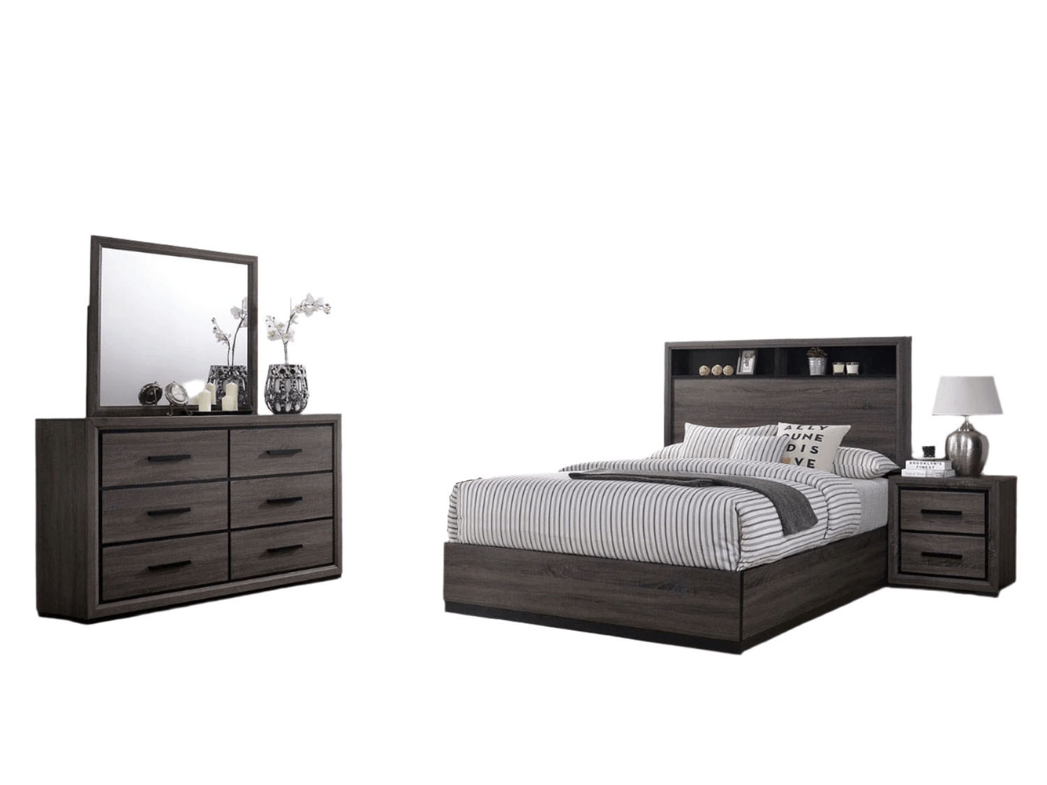 This bedroom set combines styles seamlessly, thereby creating versatile bedroom decor that fits in nearly any home design. The gray finish is smoky and sophisticated while showcasing a lovely wood grain along the drawer faces and bed paneling. A tall headboard panel would normally be the highlight of the room but two shelves let you play with votive lighting and accent pieces in a way that can make the bed your own. The accompanying case goods offer clean modern storage for your items.