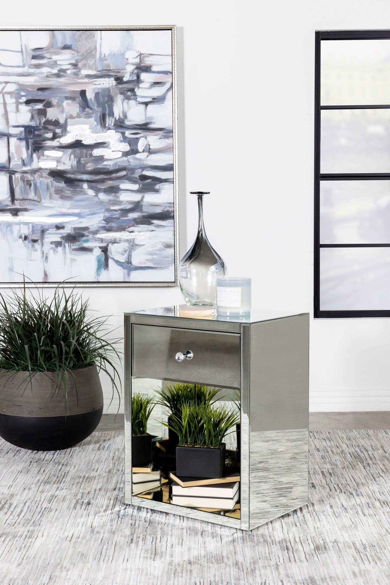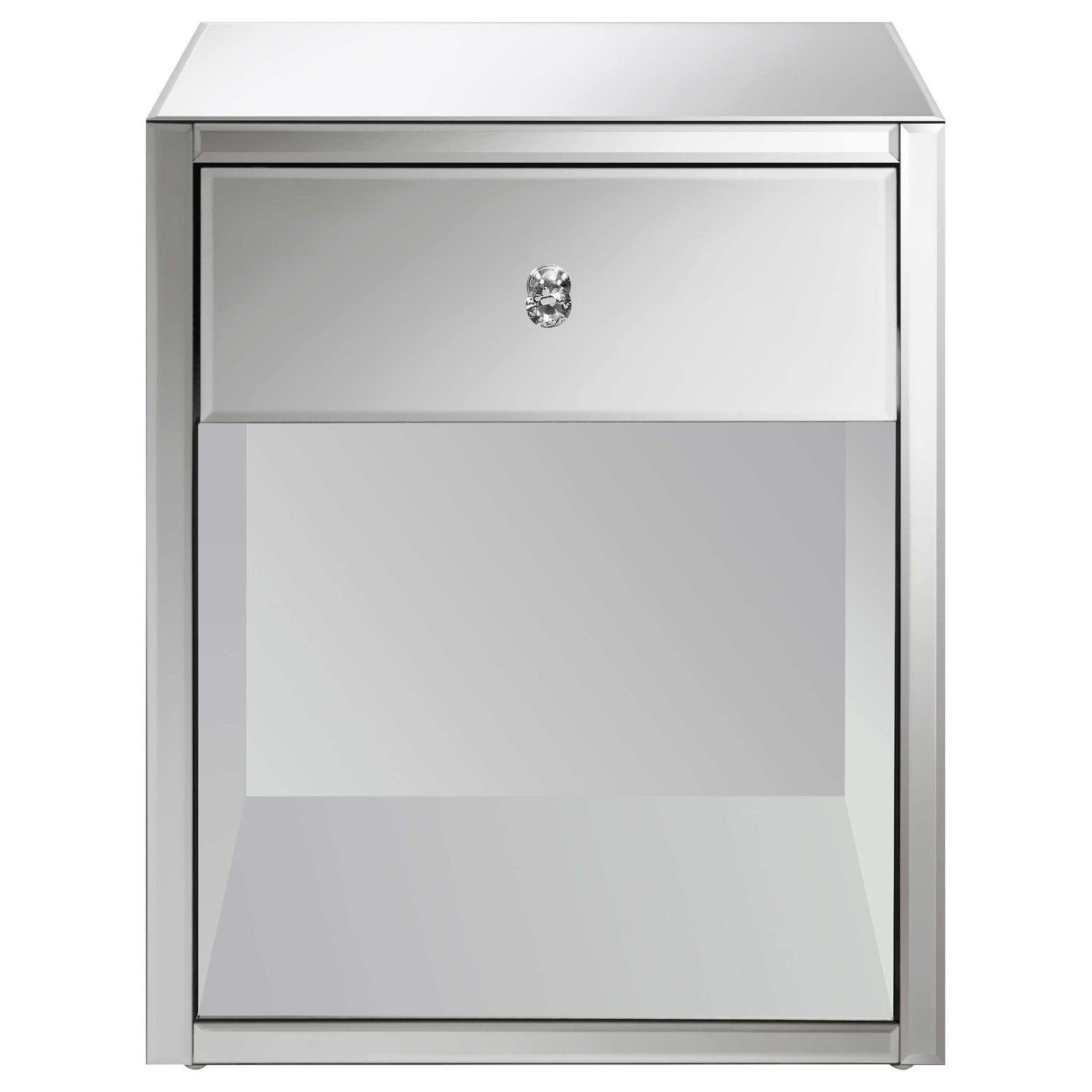 Sleek reflective surfaces elevate the modern glam look of this contemporary accent table. Covered entirely in mirror trim and paneling, this magnificently modern accent table blends into its surroundings. A single top drawer opens up to spacious interior storage. Adorned with a glimmering crystal knob, this accent table offers a wonderful polished and sparkling element of surprise for bedrooms and living rooms alike. A bottom shelf below even allows you to display decor, books, or even keep a throw basket.
