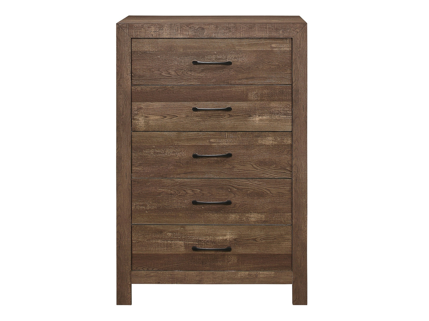 Modern lines and rustic styling are paired to create the look of the Corbin Collection. The embossed faux-wood veneer’s texture is highlighted by a rustic brown finish for a realistic wood look. Providing complementing contrast, the drawer fronts of the chest feature black metal hardware. Subtle framing defines the profile of the chest, further lending to the unfettered design of the collection.