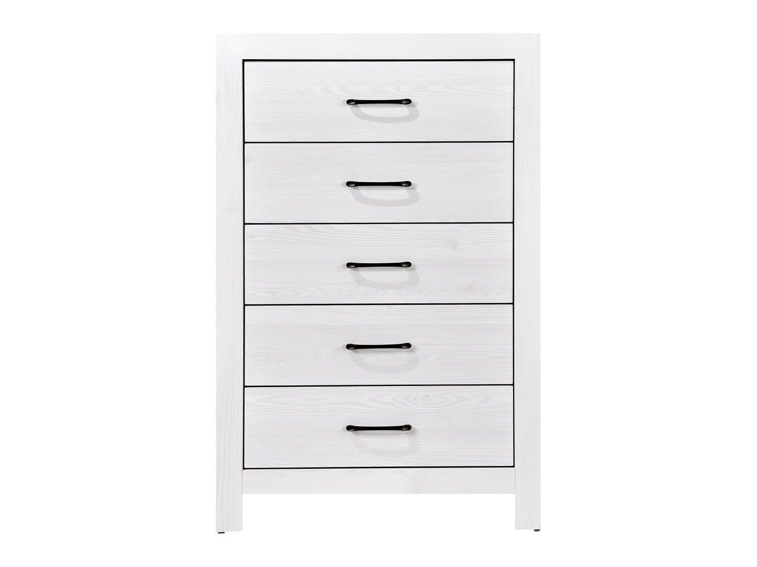 Modern lines and rustic styling are paired to create the look of the Corbin Collection. The 3D printed paper veneer’s texture is highlighted by a white finish for a realistic wood look. Providing complementing contrast, the drawer fronts of the chest feature black metal hardware. Subtle framing defines the profile of the chest, further lending to the unfettered design of the collection.