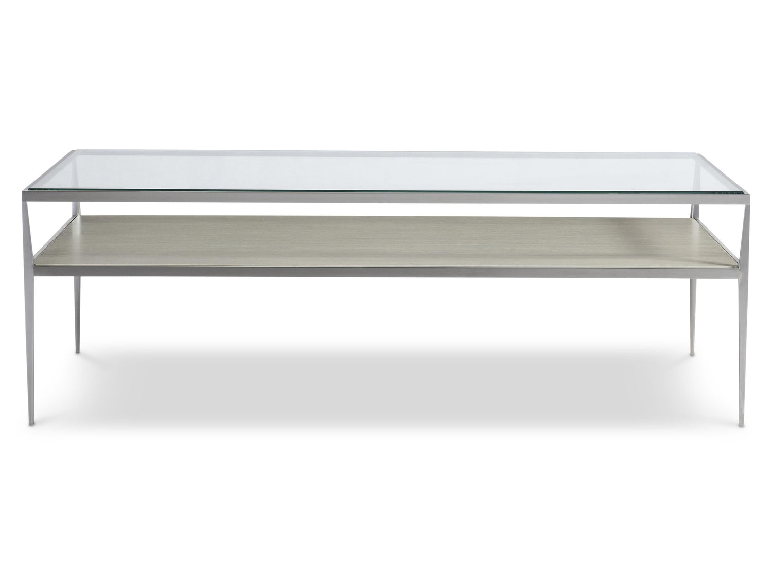 - Metal frame in Brushed Stainless Steel finish with tempered, polished-edge glass top and one wood shelf in Nebbia finish