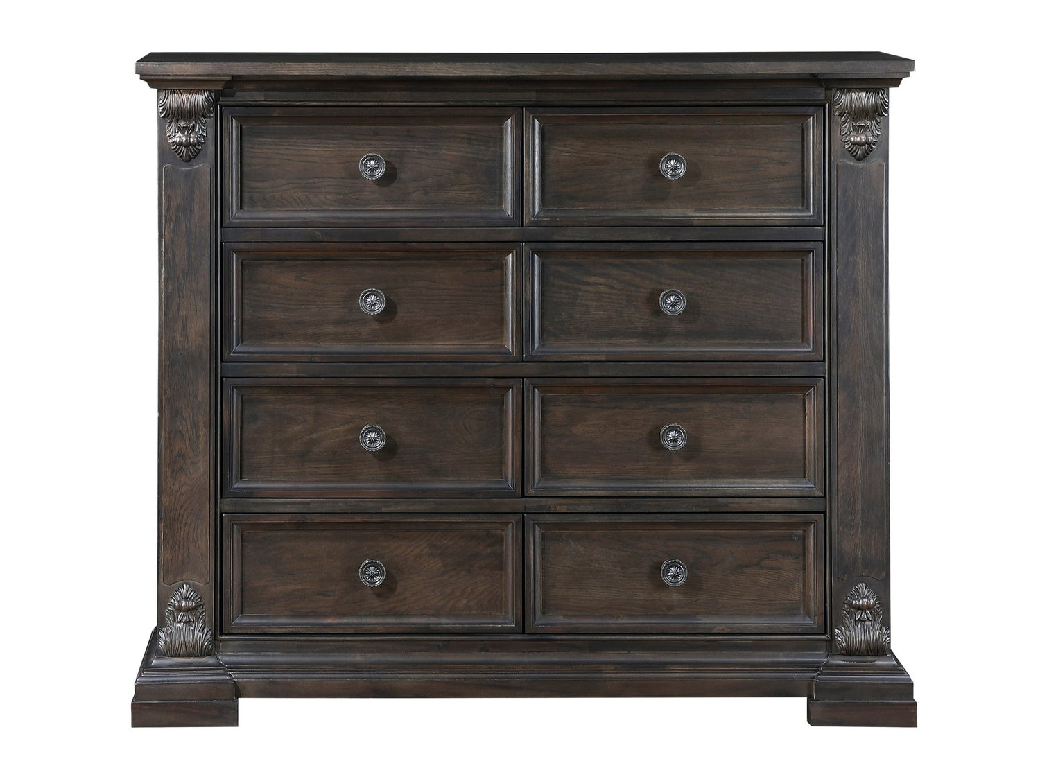 The elegant stature of the Cornwall Collection is solidified in its prominent placement in your bedroom. The chest features corbel accented pilasters, and traditional framing. An espresso-hued finish complements the oak veneer of the piece while flat black knob hardware fronts the drawers of the chest.