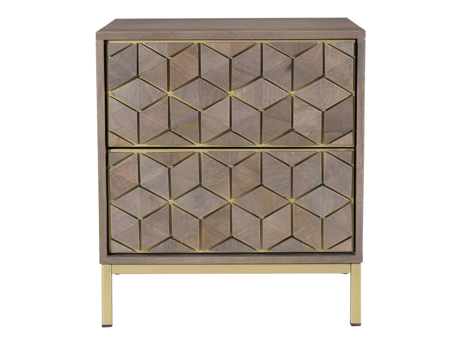 - Solid mango wood construction- Natural, brass finished metal legs and pull fixtures