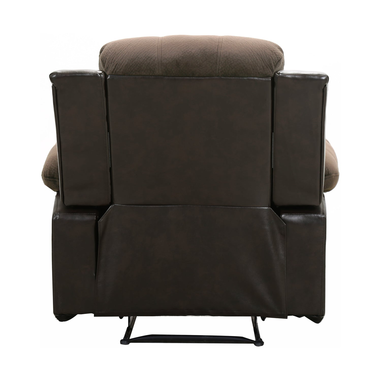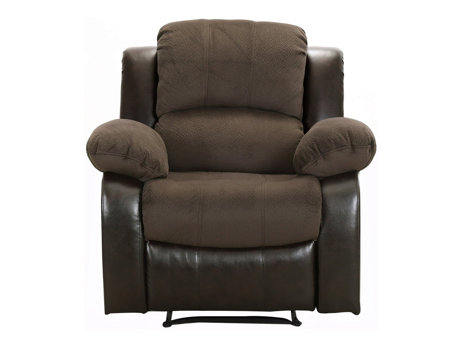 The reclining Cranley Collection utilizes a release mechanism that with a gentle pull sends you straight into your ultimate comfort zone. Chocolate textured plush microfiber with faux leather.