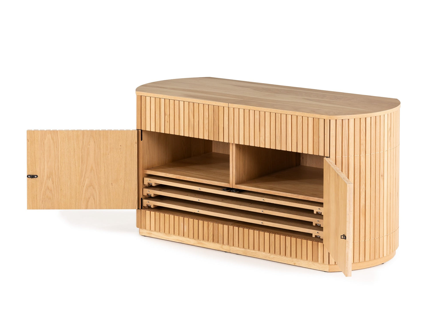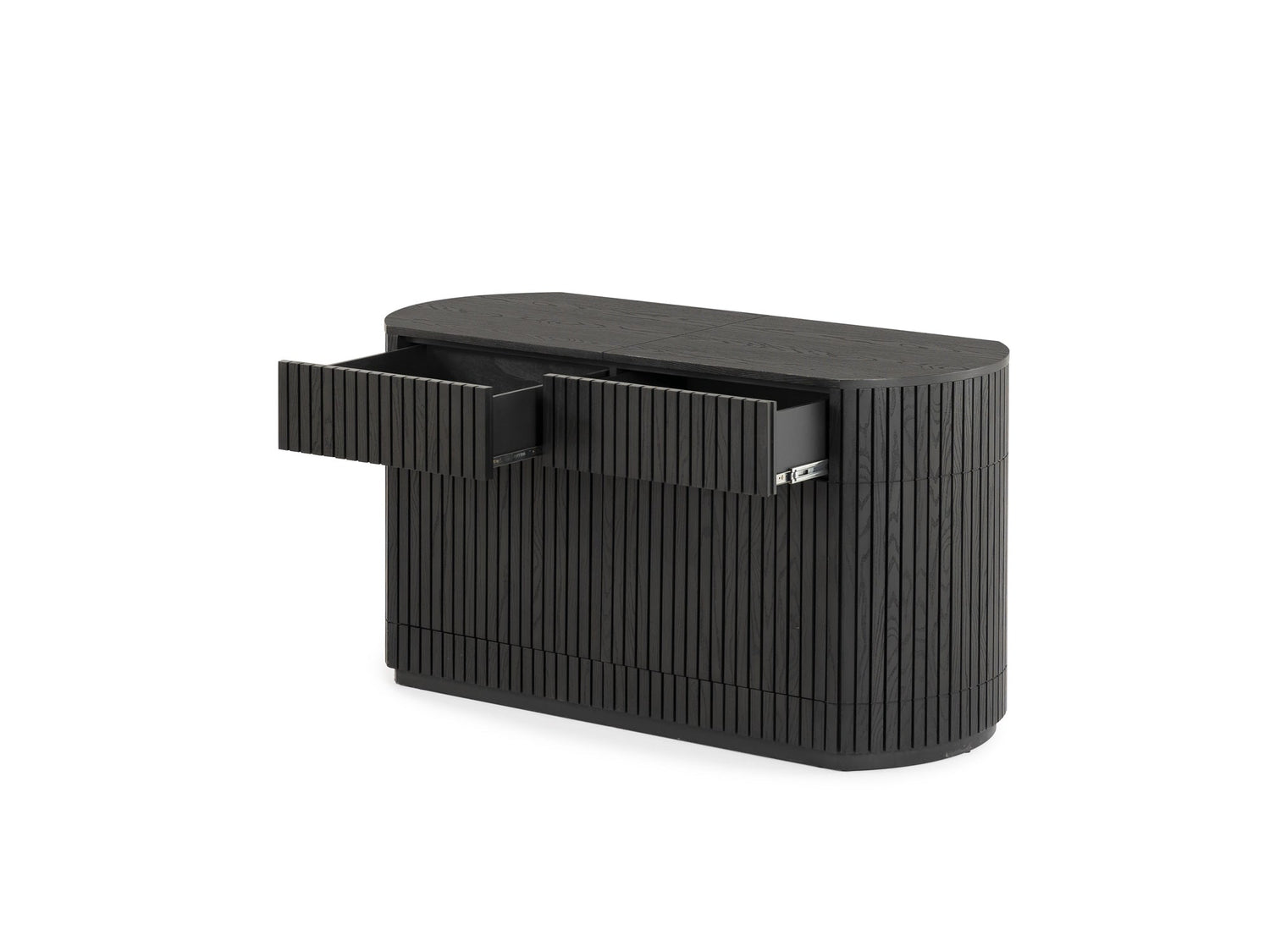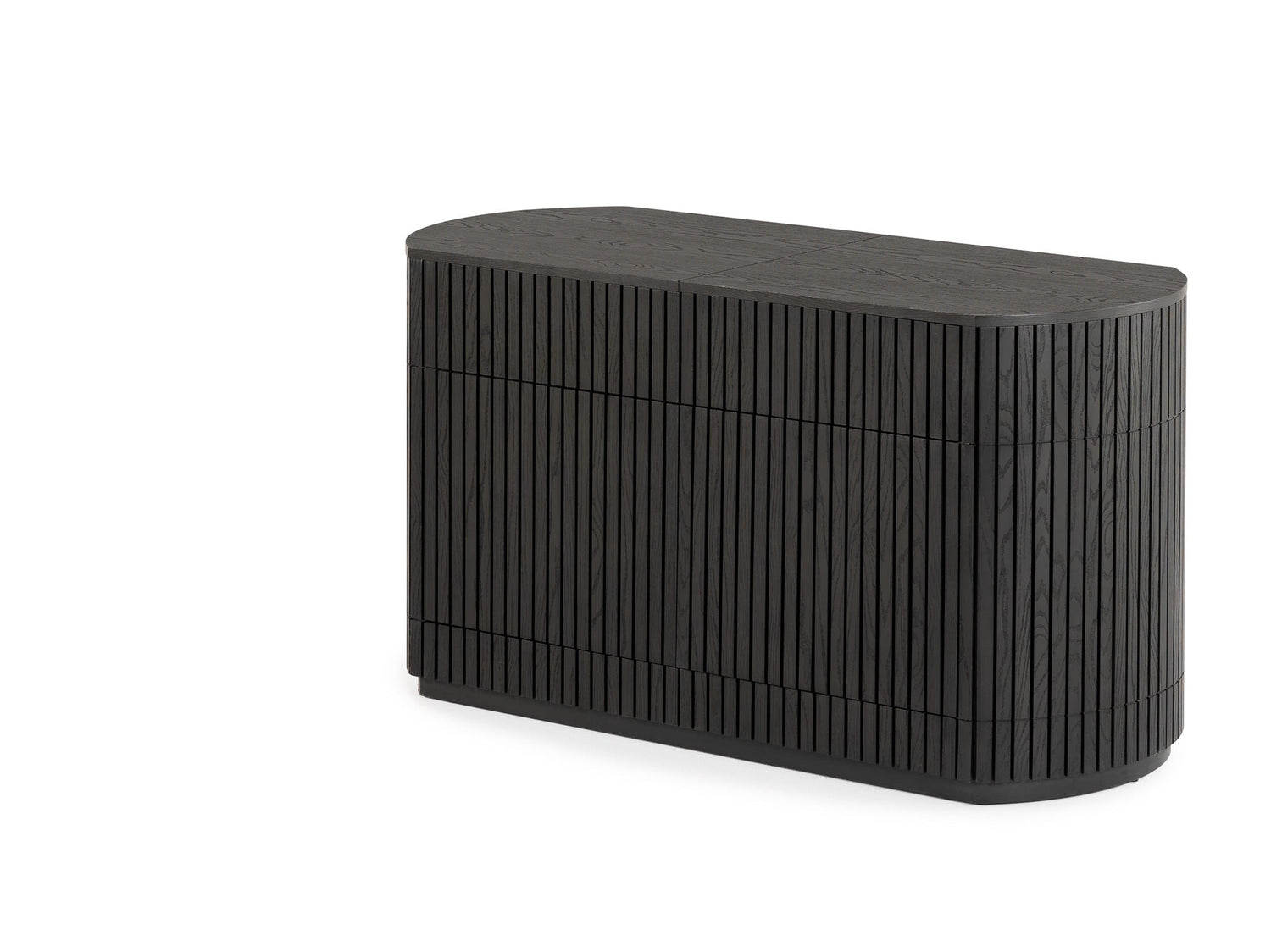The Transformer Round Sideboard - Panel Storage is a sleek and functional storage solution for your dining or living room. Its curved design houses hidden drawers, cabinets, and table panel storage, while vertical sliding panels maintain a clean, minimal look. Crafted from high-quality wood with expert craftsmanship, this sideboard offers both durability and elegance. Perfect for keeping your space organized without compromising on style, it enhances any dining or living area with its modern, versatile design.