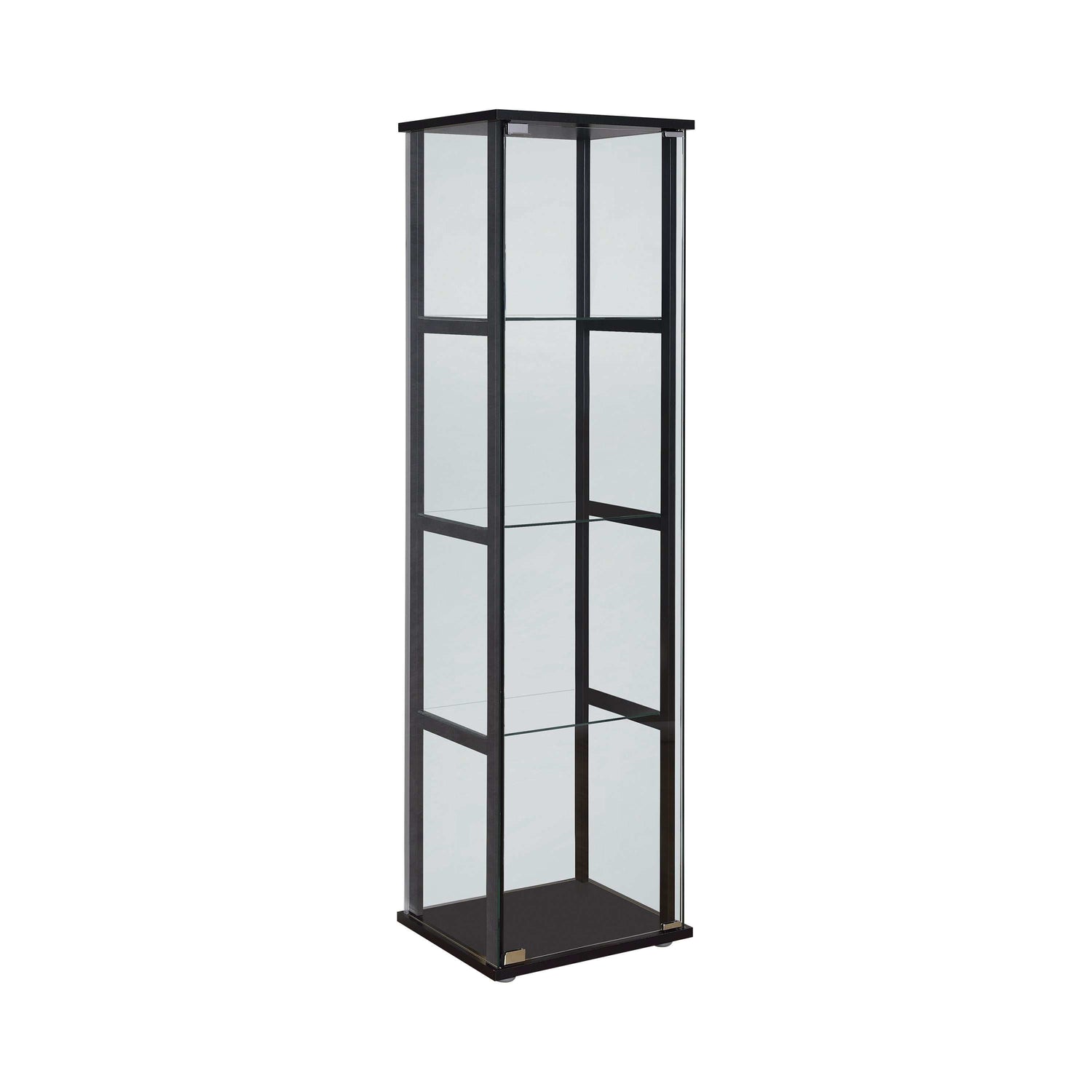 Ideal for a more compact space, this curio cabinet offers fresh and inspiring style. Simple linear design blends a slender black frame with tempered glass shelving. Push-to-open glass doors offer easy access to its interior space. This curio cabinet is an ideal venue for showcasing treasured decor and artwork. Add it to a tasteful seating ensemble or position it as an eye-catching standalone piece.