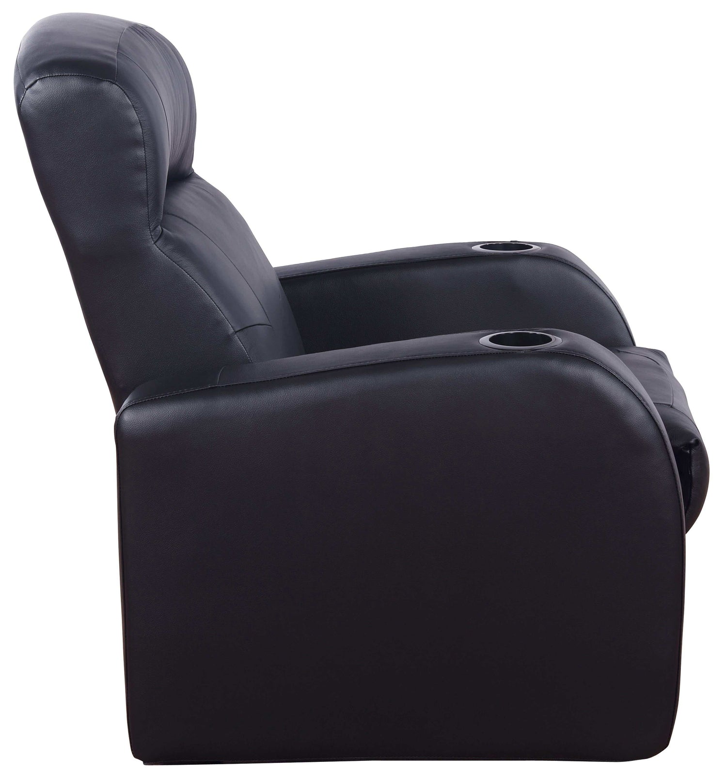 Get the movie theater experience at home with this set of recliners. Customize your home theater with your choice of seating configuration, available in numerous options. Optional center consoles offer unique storage for remotes and small items. Each top grain leather recliner is designed with its own cup holder for your favorite beverage. These black recliners are bound to improve your home theater experience and comfort levels.