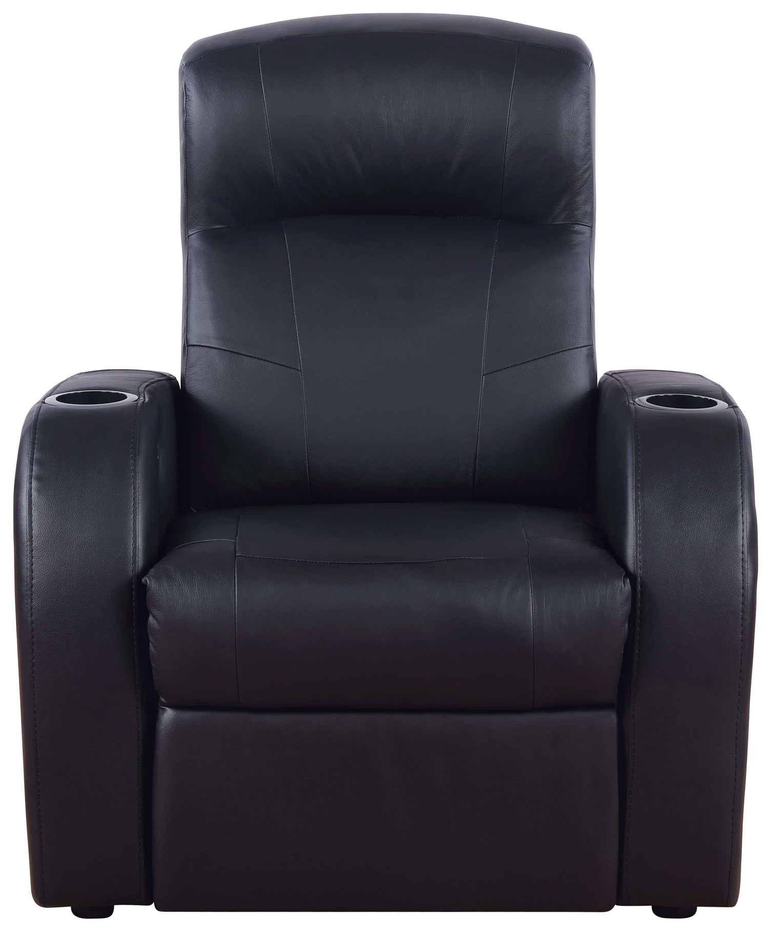 Get the movie theater experience at home with this set of recliners. Customize your home theater with your choice of seating configuration, available in numerous options. Optional center consoles offer unique storage for remotes and small items. Each top grain leather recliner is designed with its own cup holder for your favorite beverage. These black recliners are bound to improve your home theater experience and comfort levels.