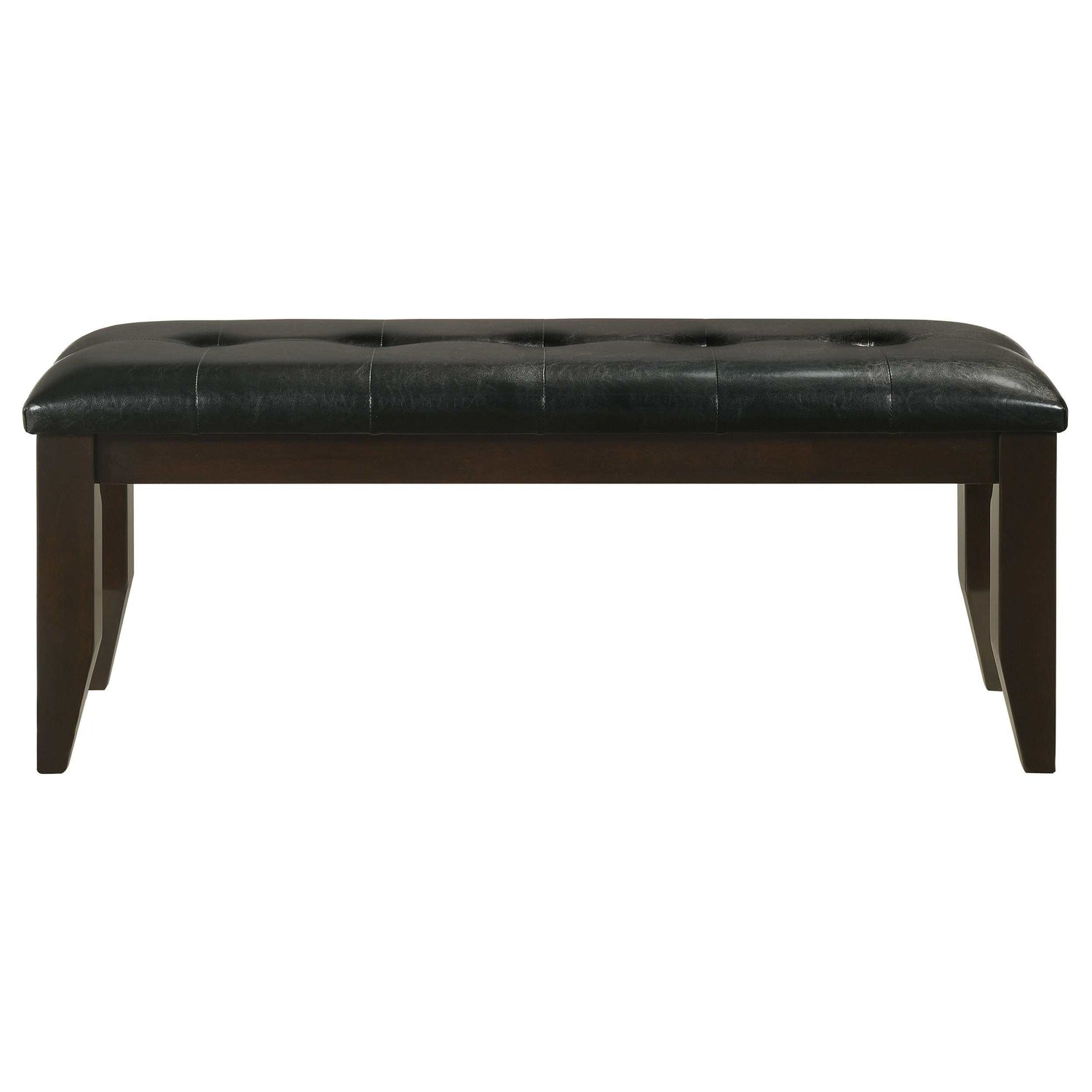 Create a crisp feel in any dining room with this six-piece dining set. Complete with a rectangular table, four side chairs, and a bench, this set is casual and clean. Featuring a rich cappuccino finish, the select hardwood and oak veneer construction add sturdy structure. Classic shapes and simple lines are given a sophisticated feel with the dark hue. Full of delicate details, the seats are complete with subtle cut outs along the seat backs and tapered legs.