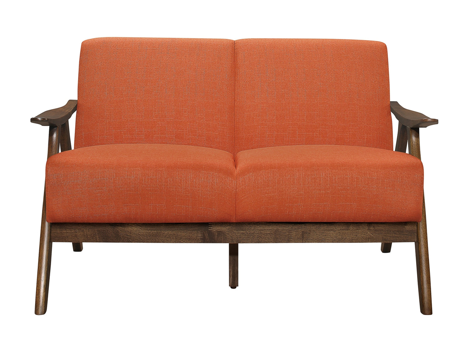 The retro-inspired wood framing of the Damala Collection will perfectly accent your modern home décor. Subtle contouring to the love seat’s wood frame is finished in walnut, presenting as a classic complement to the orange fabric that covers the padded love seat’s seat and back.