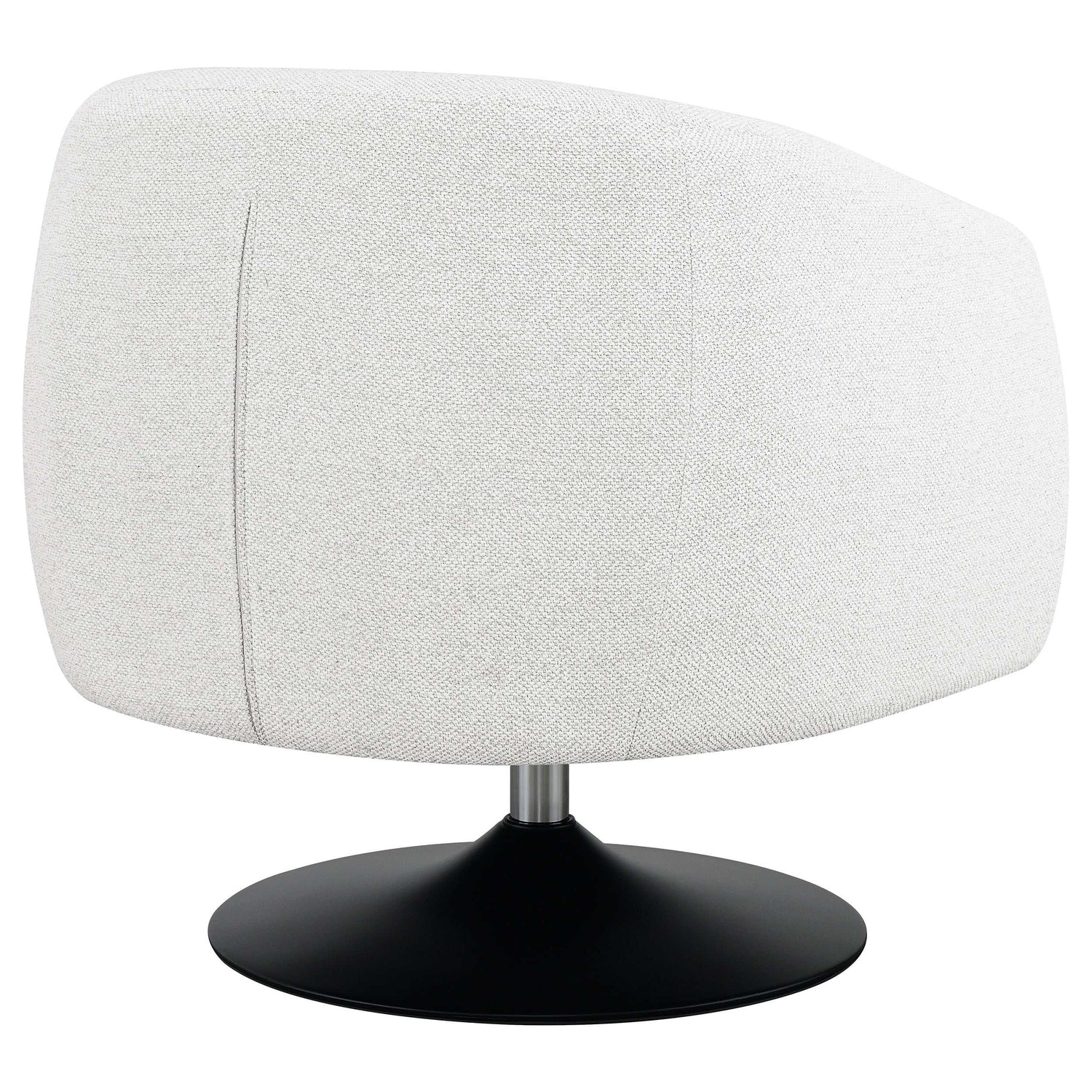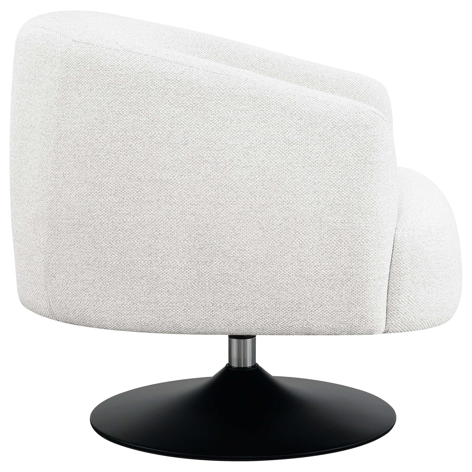 Wrapped in a beige boucle fabric, this contemporary swivel accent chair is the perfect addition to a vintage-inspired home. A throwback to a retro era, the chair offers a barrel style design situated on a pedestal base, swiveling 360 degrees. A wonderful addition to a conversational seating arrangement or open floor plan entertainment space, this chic swivel chair also offers a softly rounded back with subtle channel tufting and tapered off armrests. A waterfall-style, tailored seat cushion further lends to the clean lines of this clever, versatile accent chair. The matte black finish on the base also adds a striking contrast for a modern touch.