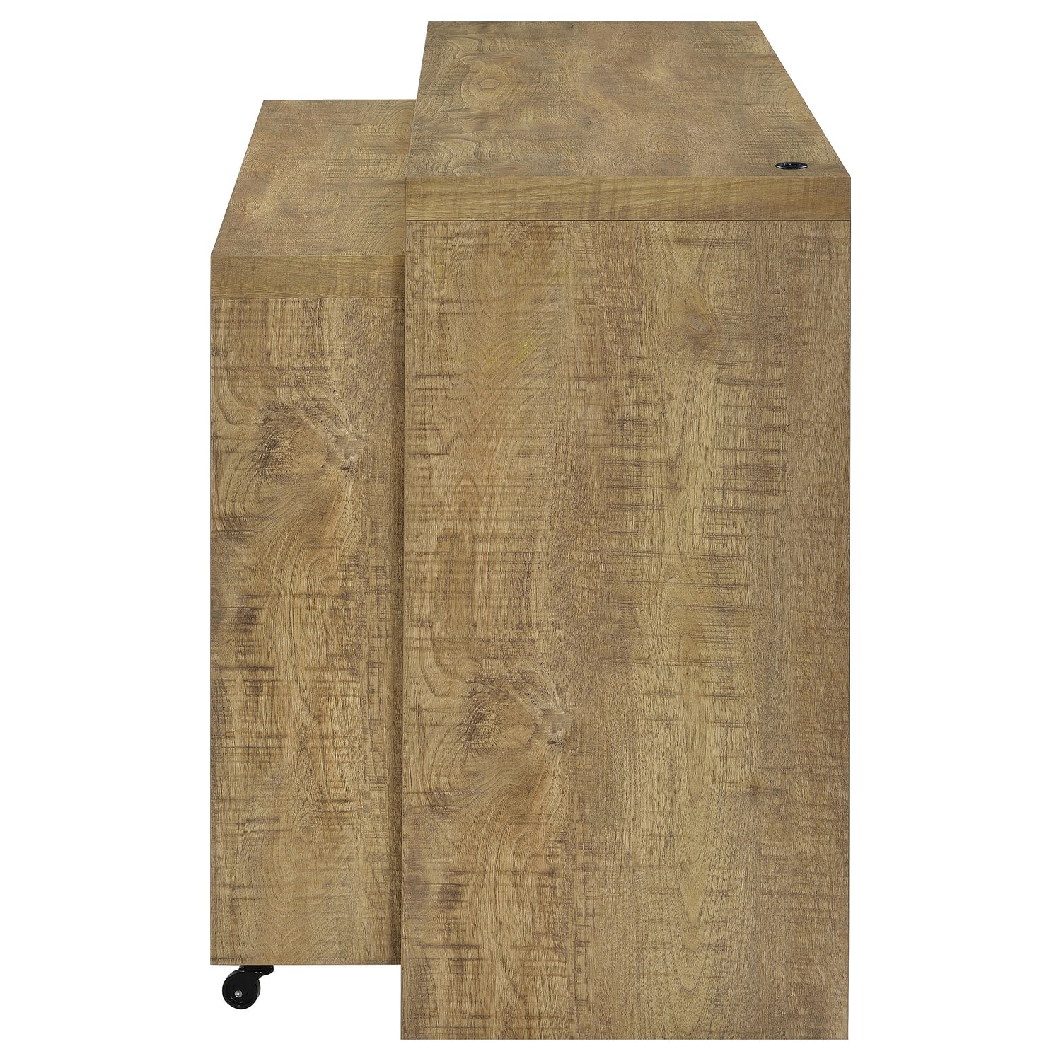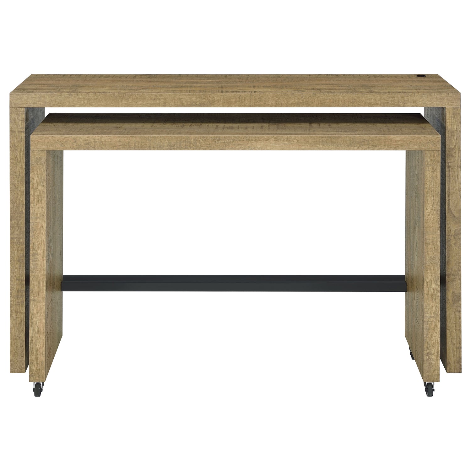 - Smaller table is on wheels and nests under the larger, which includes a USB port in the tabletop
