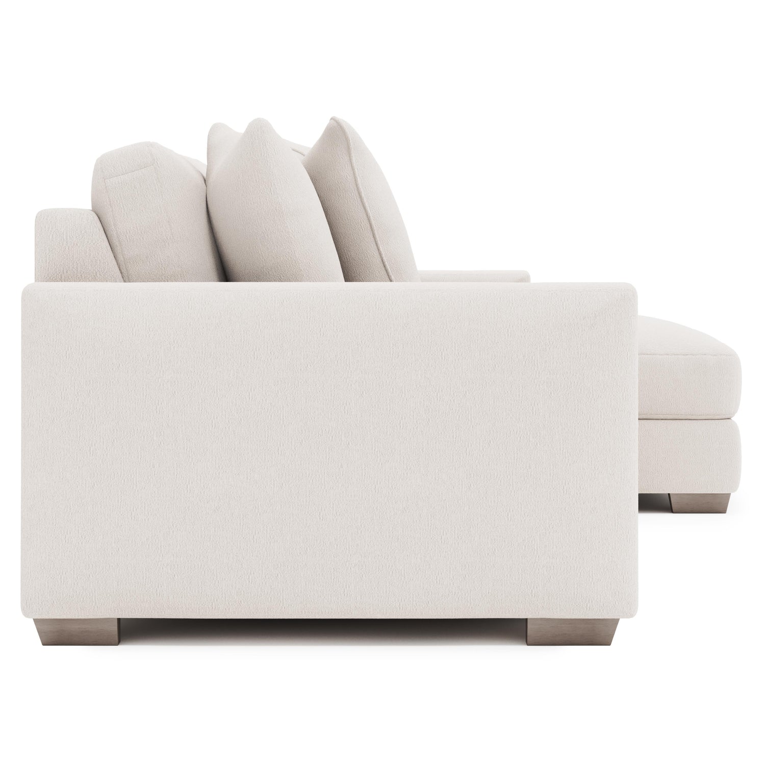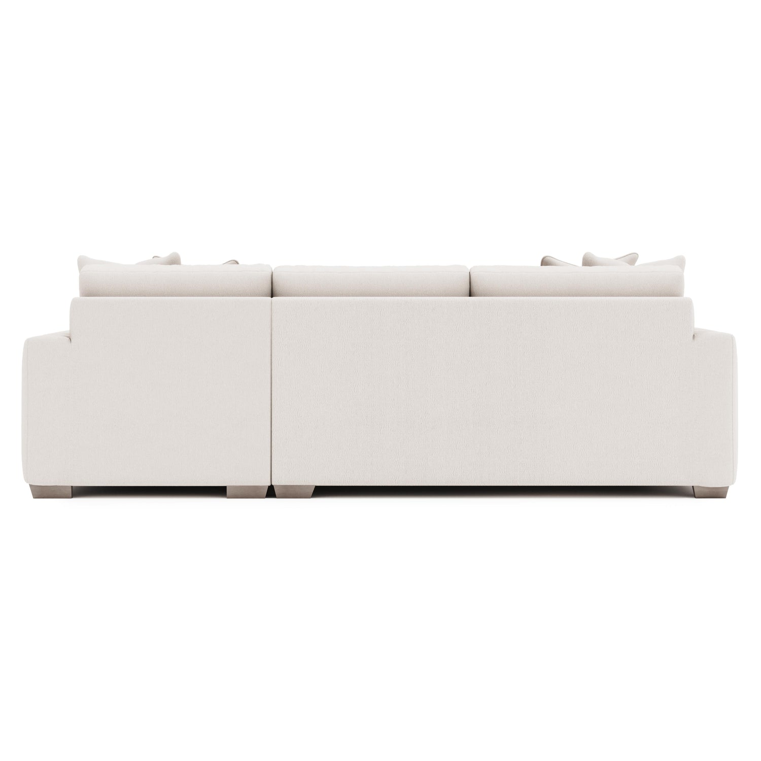 The Dawkins sectional offers casual comfort with a high-end look. The timeless modern design features wide track arms and tapered block feet, available in a variety of wood finishes. Plush cushions and fiber back pillows make this sophisticated sofa the perfect place to lounge in style.
