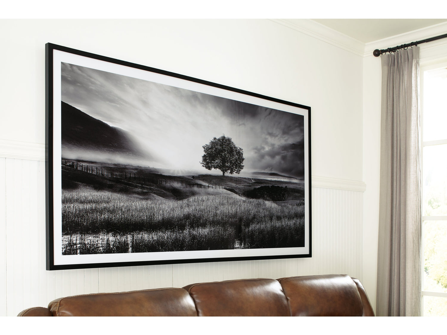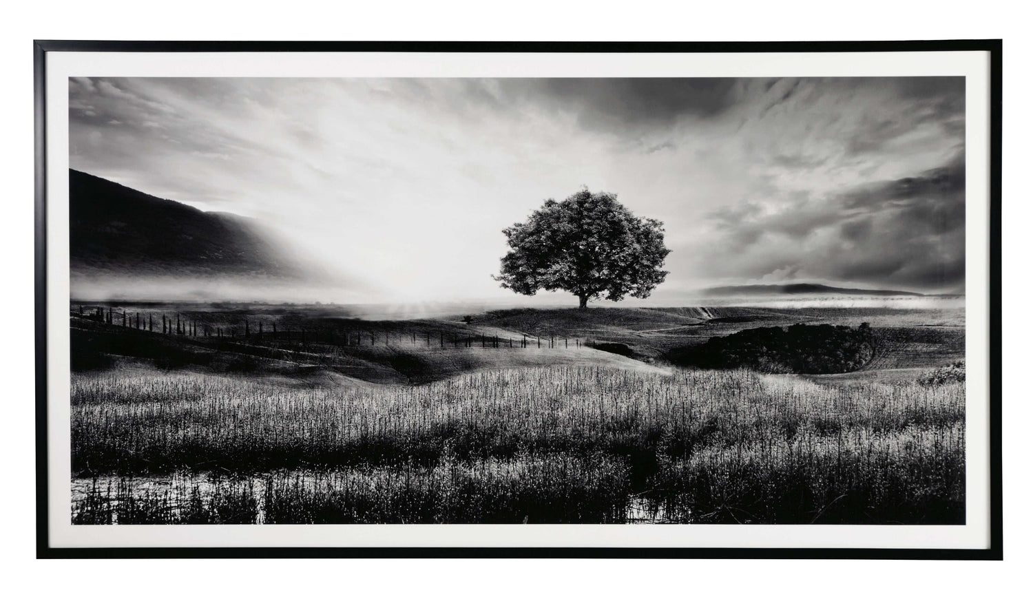 Filled with calming natural elements, this wall art has a refined look with a restful feel. It captures a landscape with rolling hills, drawing your eye to the tree standing tall in the center of the creation. Lighter tones in the clouds bring brightness to the black-and-white design, making for a striking addition to your modern decor.