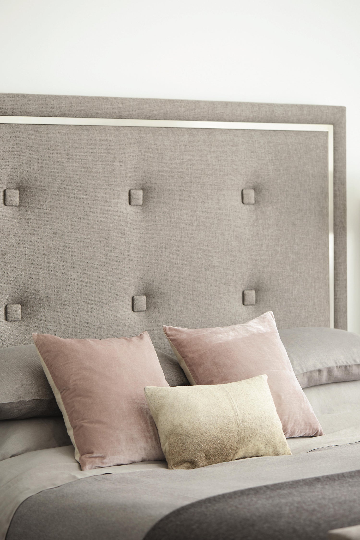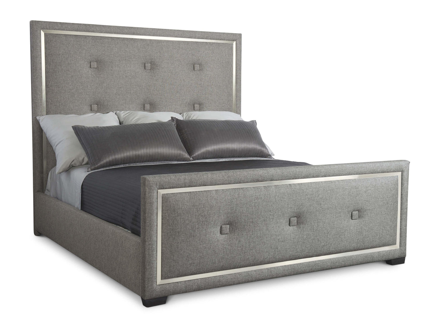 - Upholstered headboard and footboard with inset Stainless Steel frame overlay inside of upholstered border in Silver Mist finish