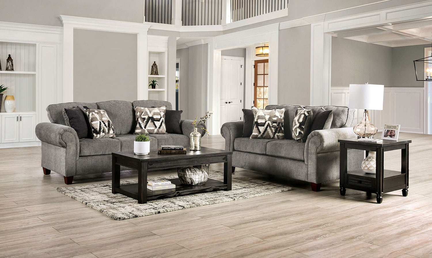 Transitional but with a little bit of flair! That's what this set is all about. The rolled arms and welt trim are classic elements, while catchy, abstract patterns are provided by the accent pillows. Your eyes will appreciate the splash of colors the pillows provide against the backdrop of neutral base colors. Meanwhile, your sense of touch will welcome the softness and welcoming warmth of the chenille fabric.