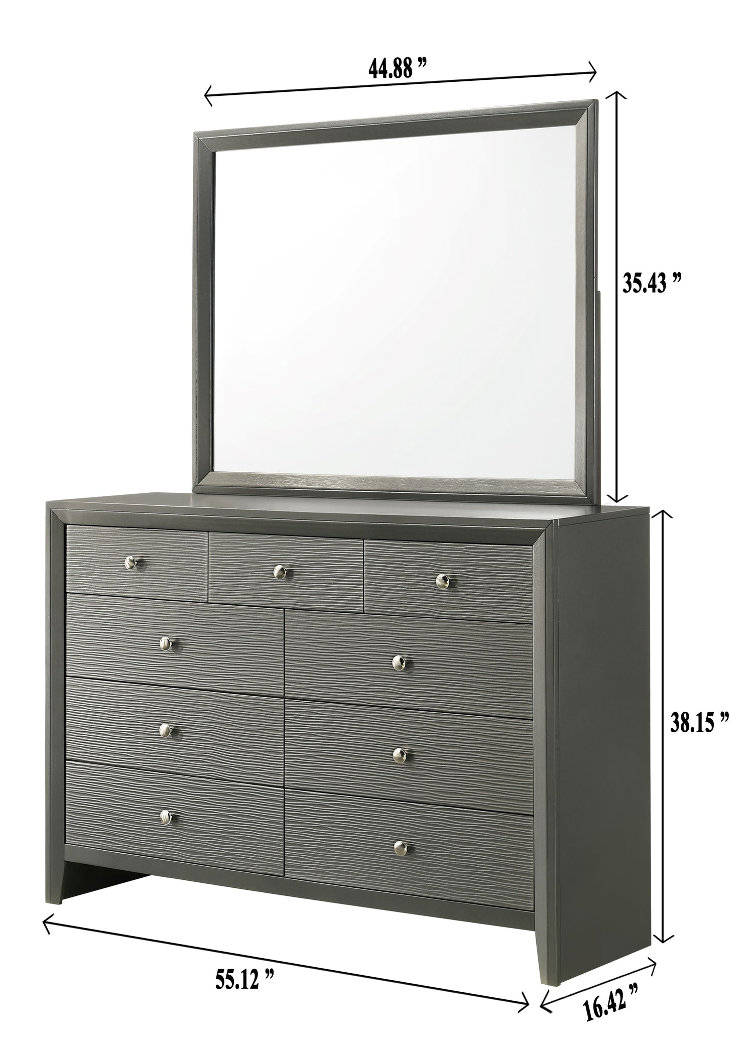 The Denker Gunmetal Panel Bedroom Set brings a bold, modern presence to any space with its rich gunmetal tone and striking geometric paneling. The bed serves as a contemporary focal point, offering clean lines and an architectural aesthetic that elevates the entire room. Coordinating pieces—including a refined nightstand, a spacious dresser, and a sleek mirror—showcase a cohesive design that blends style with everyday practicality. Minimalist hardware in a subtle metallic finish adds the perfect touch of contrast, completing this sophisticated ensemble.