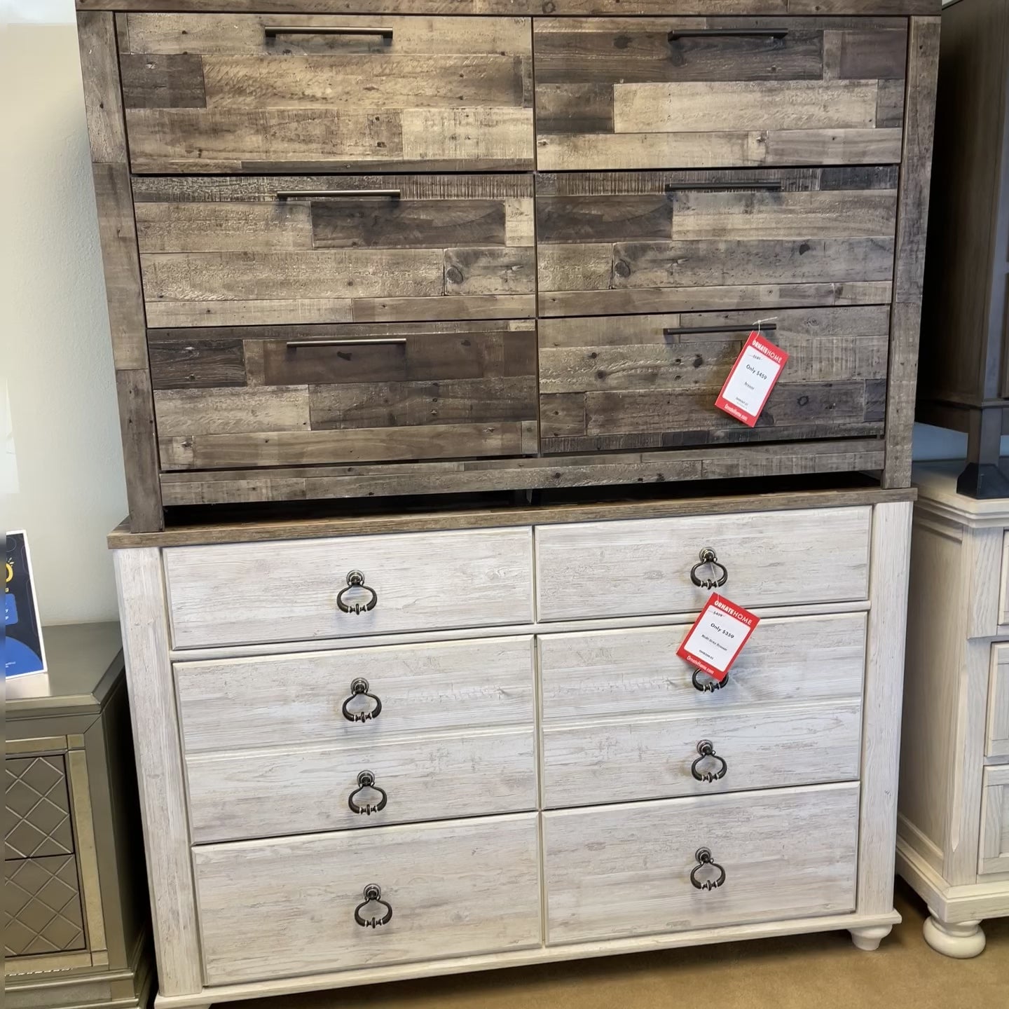 Modern yet hefty. This dresser and mirror set makes an urban eclectic statement. The seasoned raw wood look merges with the clean-lined design we love today. A muted rustic finish over replicated pine grain maintains its authenticity. Roomy drawers are flanked with attractive framed fronts and pilasters. Handles with antiqued gunmetal finish complete this beauteous look with easy-to-pull function.