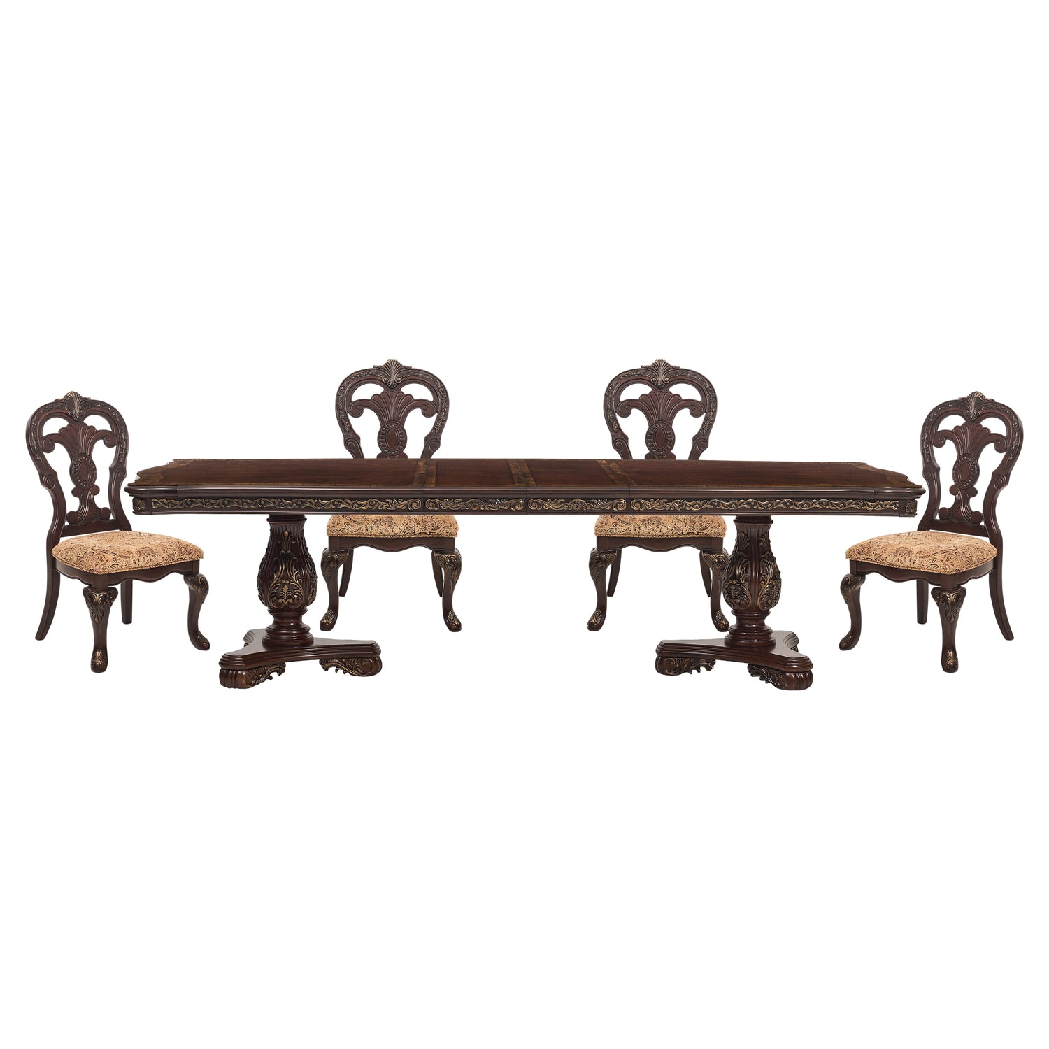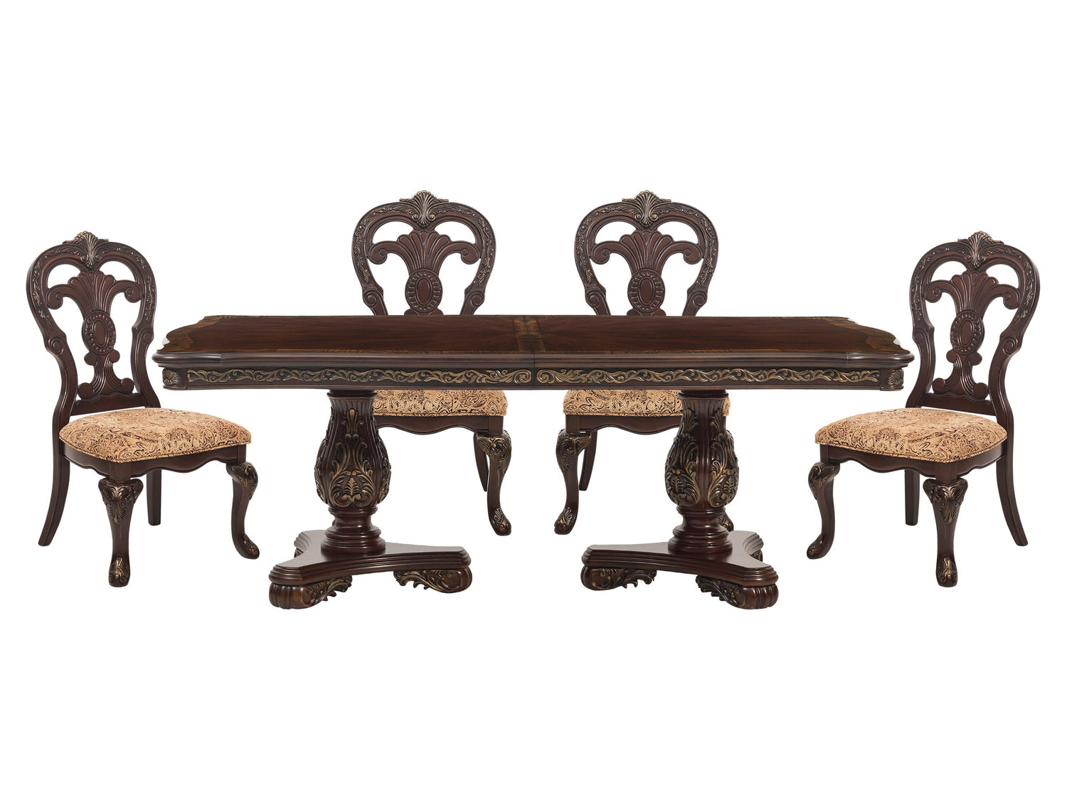 - Dining set includes dining room table and 4 side chairs