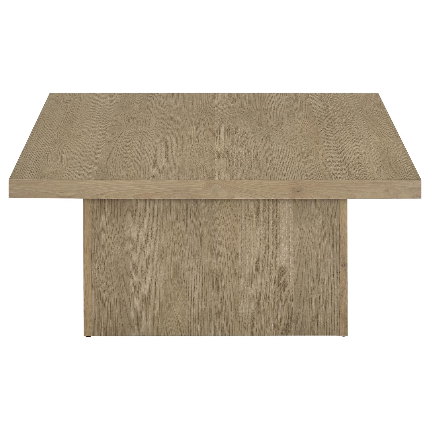 - Square coffee table in latte brown offers bold shape and grounded modern styling,