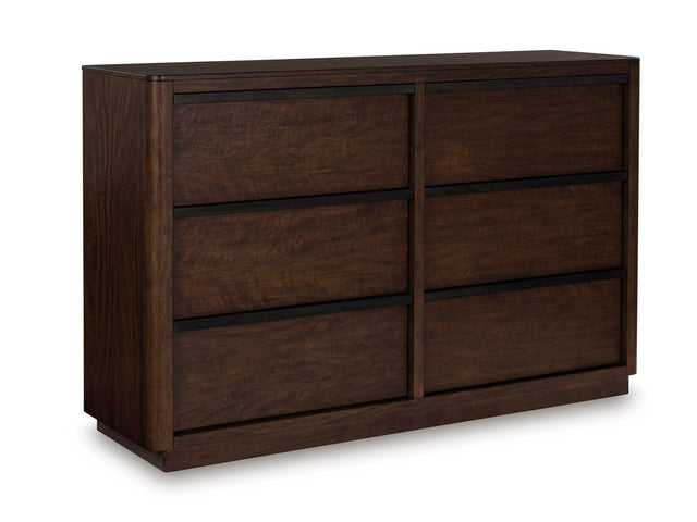 Casual contemporary styling with a decidedly modern vibe. This dresser is warm and inviting with a rich dark brown finish, adorning your restful retreat with on-trend elegance. Full-length metal pulls in a matte black finish add a subtly cool touch to spacious storage drawers. What a simply stunning way to achieve the bedroom of your dreams.