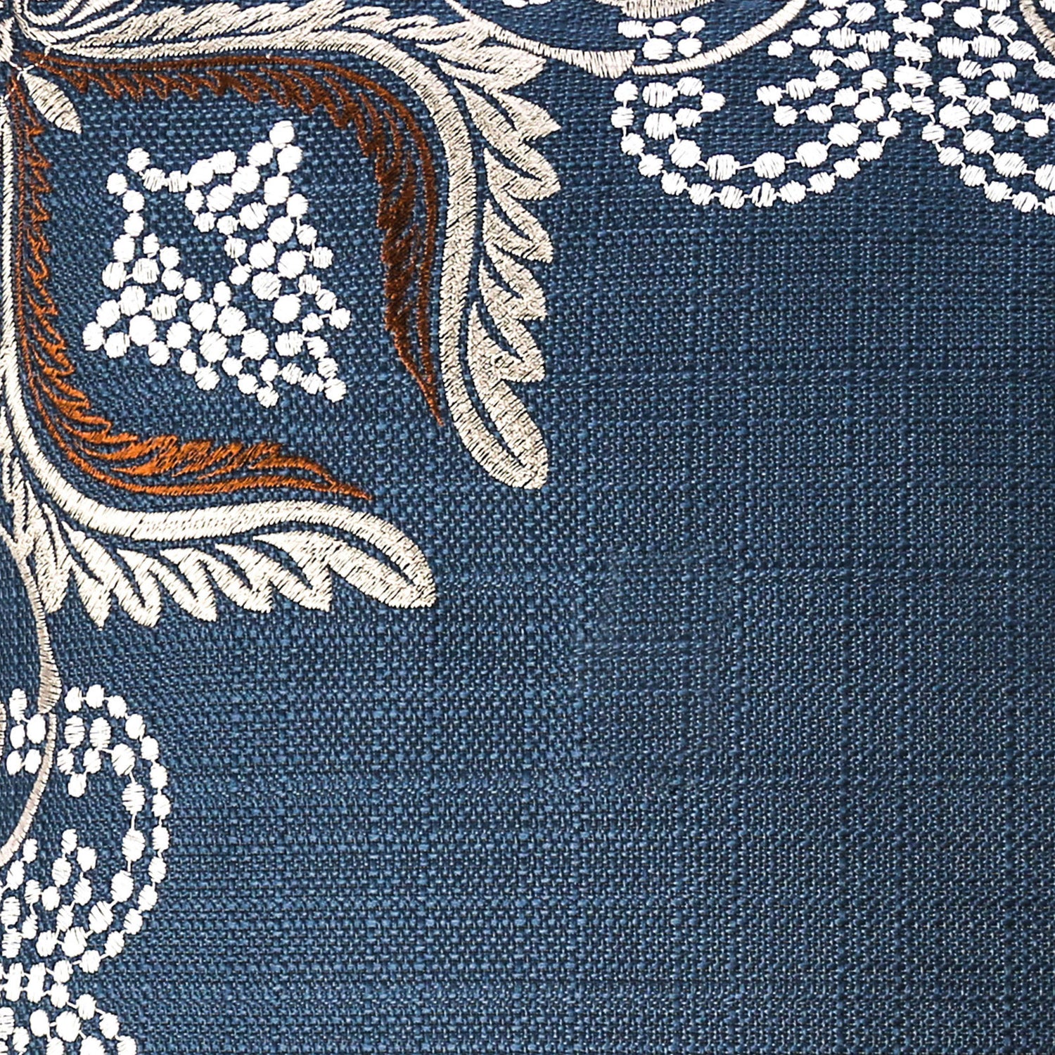 The edges of this dark navy pillow is decorated with ornate designs, featuring foliage and feather motifs.