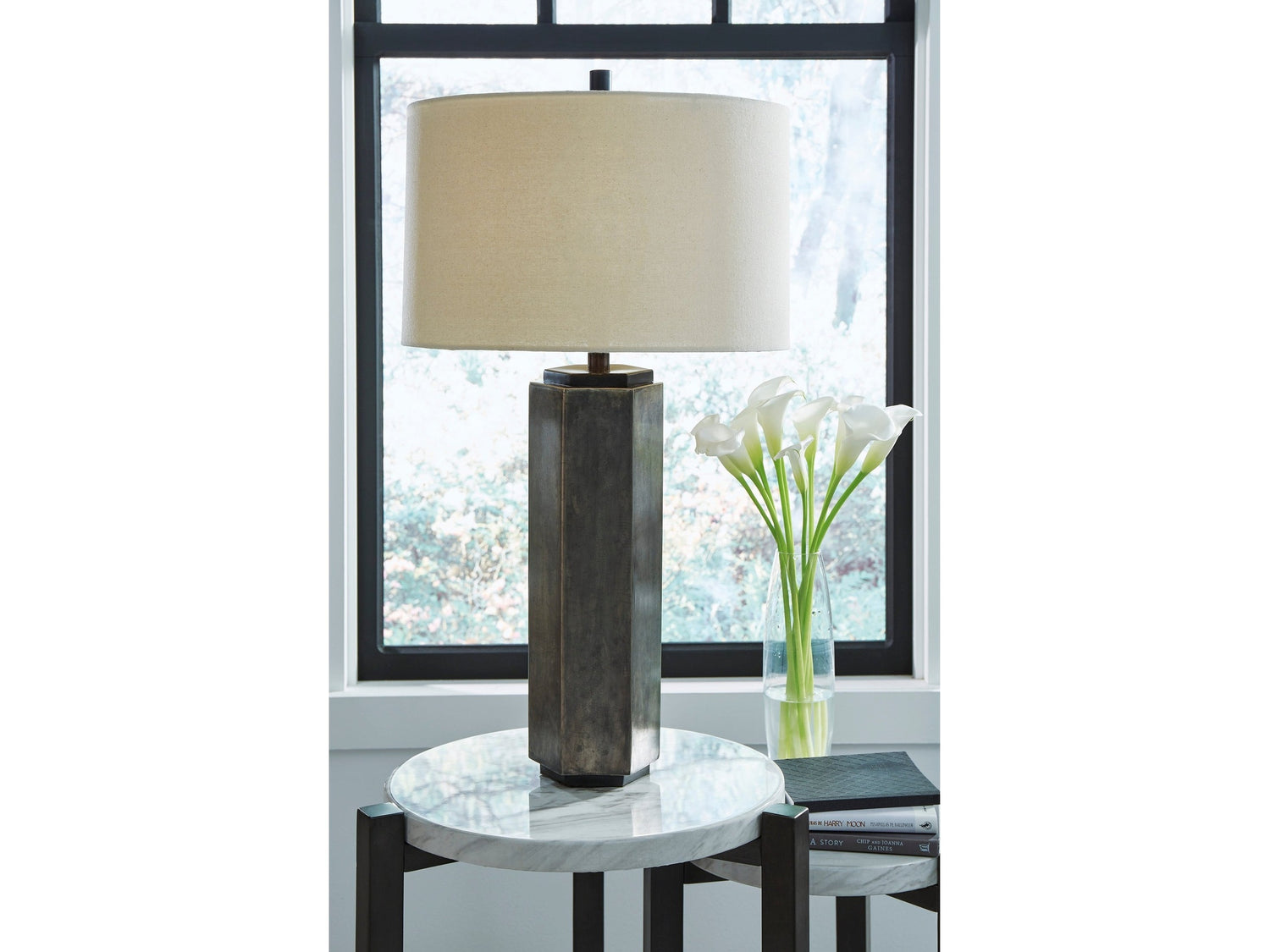 Why settle for standard light fixtures when this table lamp adds so much warmth and style? This hexagon-shaped lamp features an antiqued pewter-tone and black finish topped with a drum shade. Whether lighting a living area, bedroom or entryway, this piece will steal the spotlight wherever it lands.