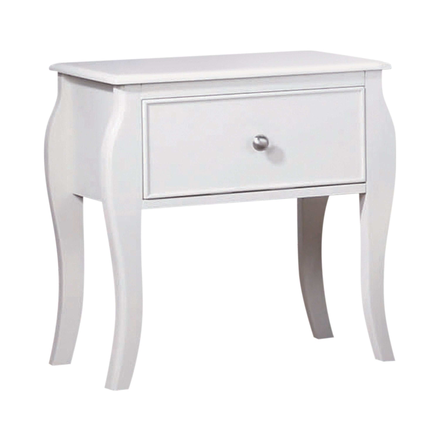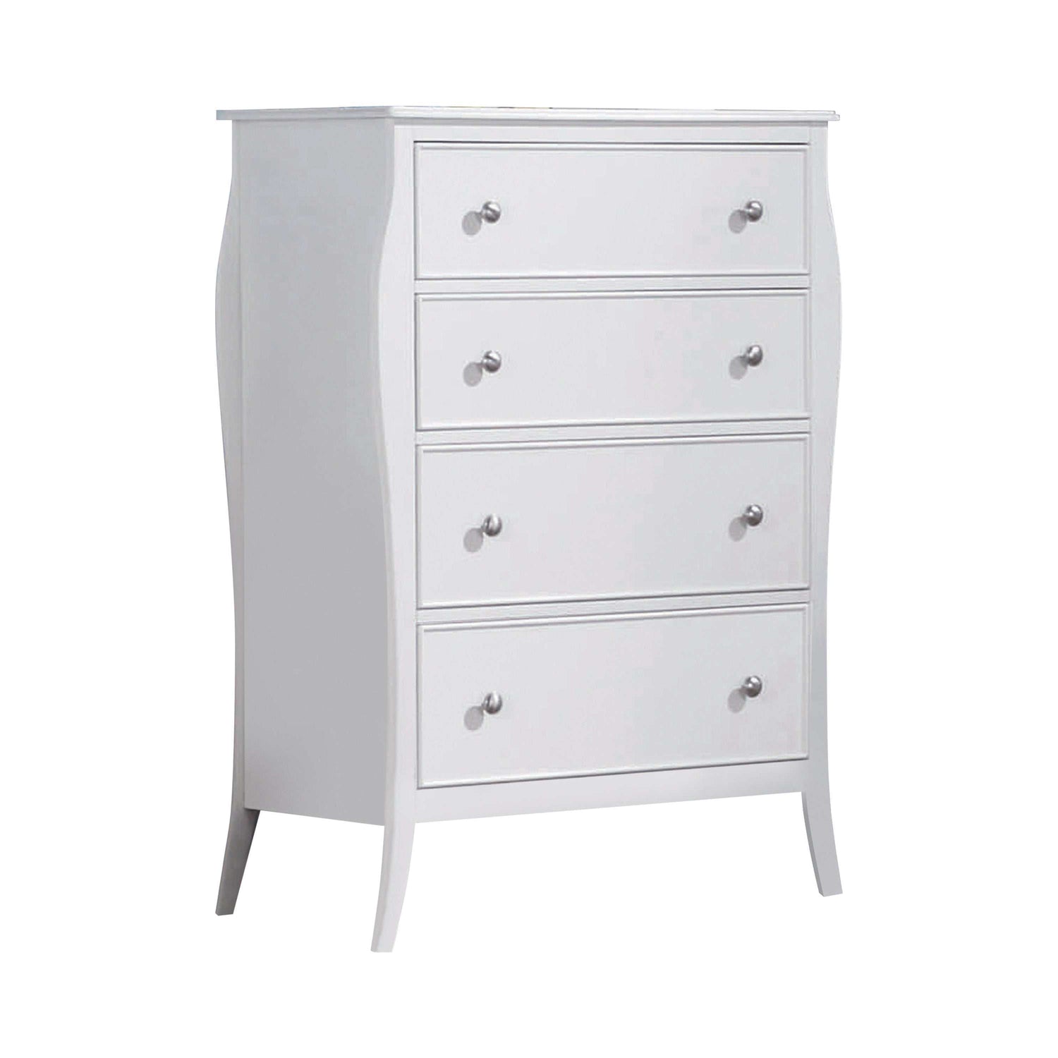 Inspired by the French countryside, this charming five-piece bedroom set is full of flair. With a chest, bed, nightstand, dresser, and mirror, the gentle curves in each silhouette are streamlined with silver metal hardware. Crisp white simplifies and opens up a country chic space. Craft a beautiful focal point in the center of a room with the simple curved molding and flared posts from the sweet bed frame. Full of ample storage, the raised legs and smooth drawer fronts are smooth and romantic.