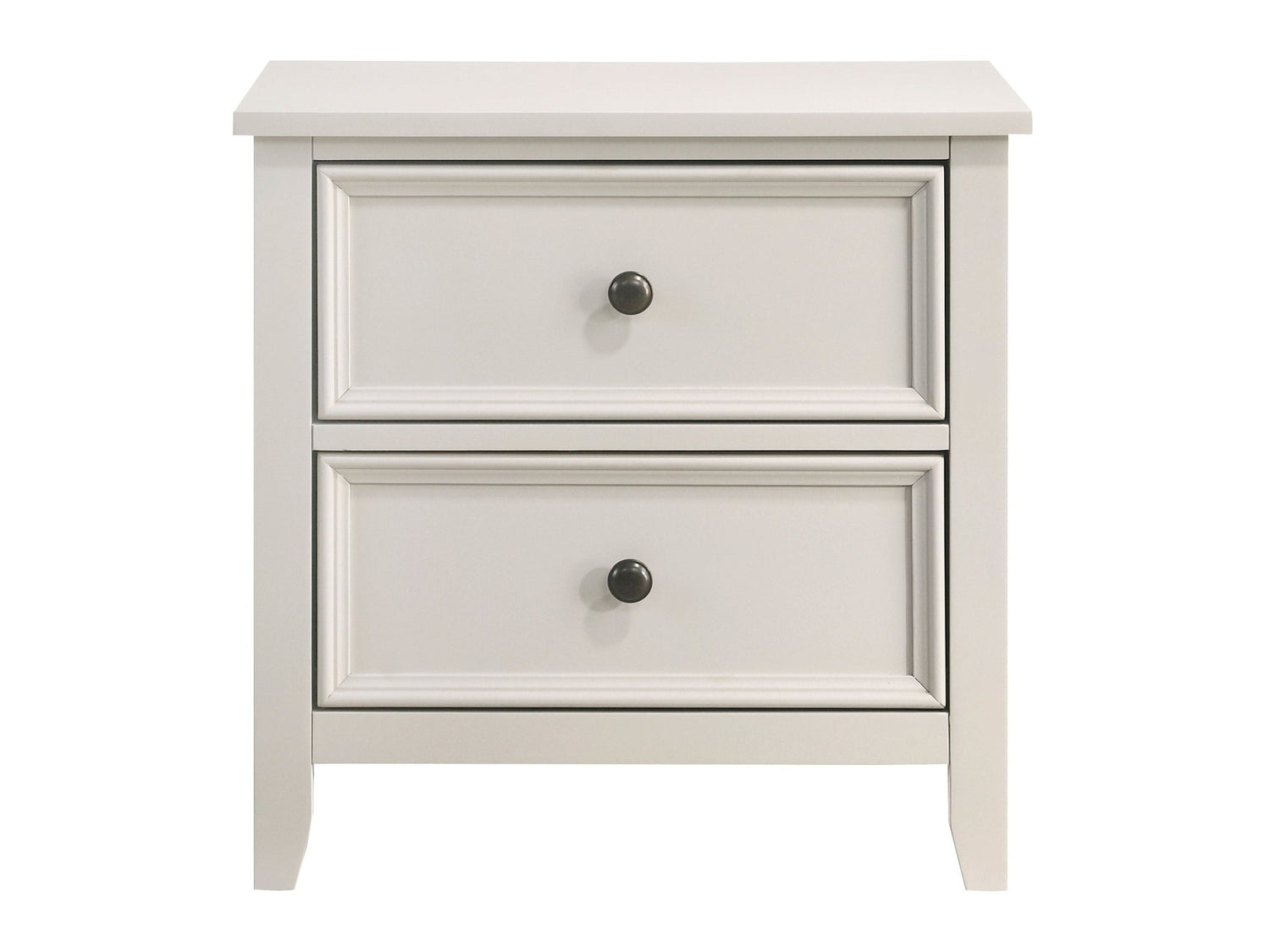Hints of farmhouse living create the look of the Donahue Collection. The white finish of the collection is a subtle canvas for your bedroom’s décor. Framed shiplap-inspired panels lend a classic decorative accent to the nightstand while knob hardware fronts the drawers piece.