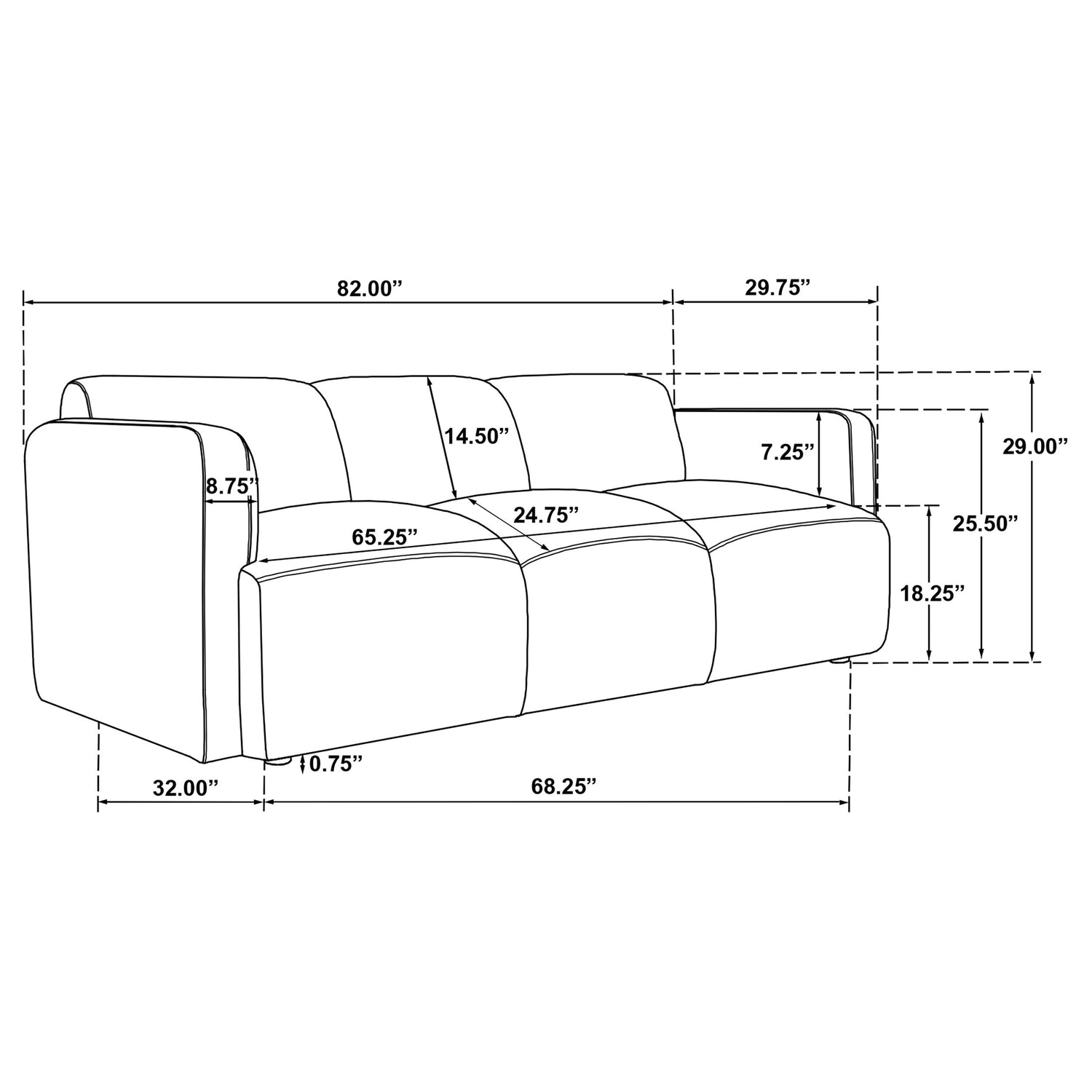 Overall Dimensions (Inches):Sofa: W: 82 x D: 36.75 x H: 29.25 x SH: 18.25 x SW: 65.25 x SD: 24.75 Weight (lbs): 111.35