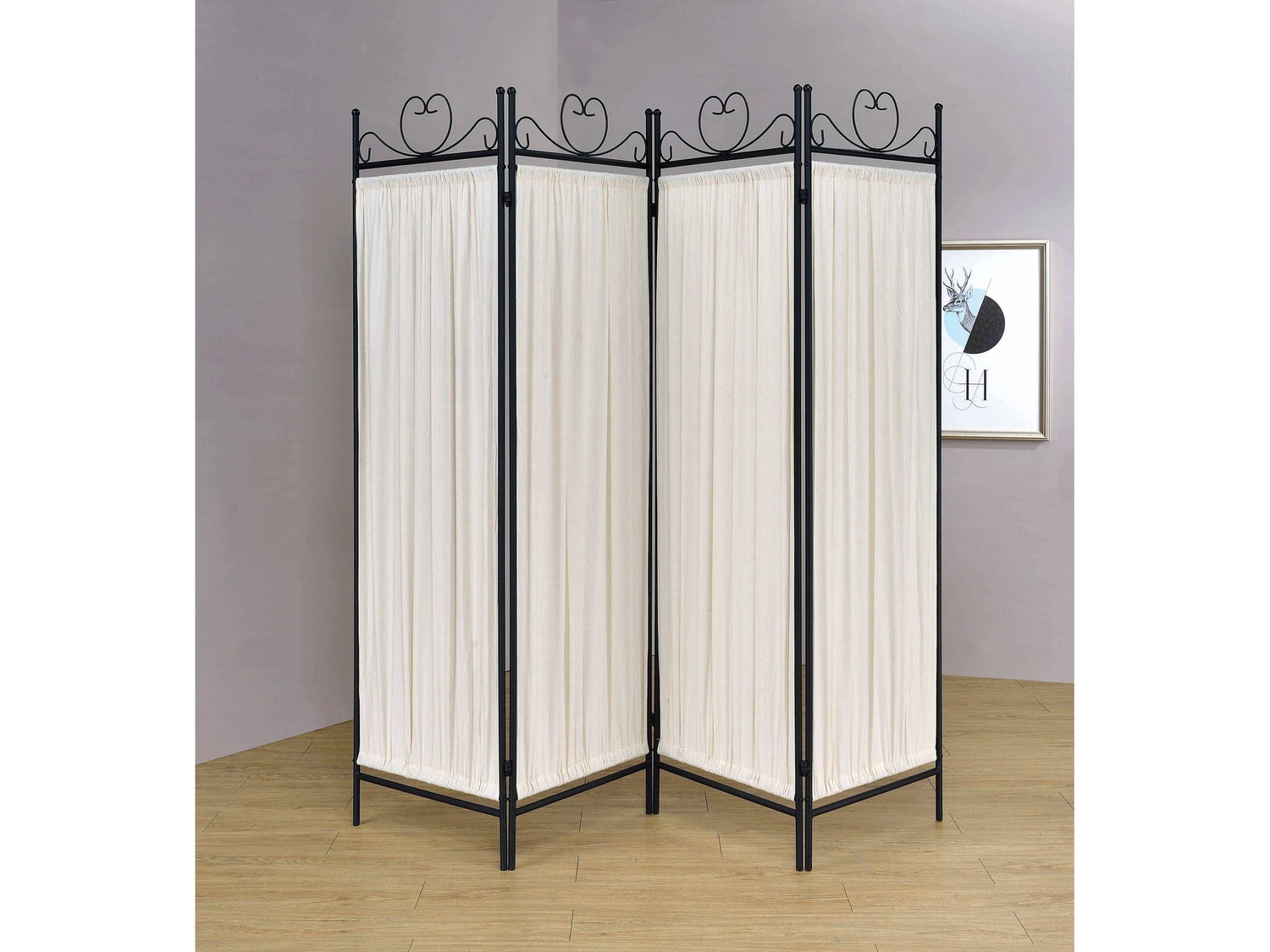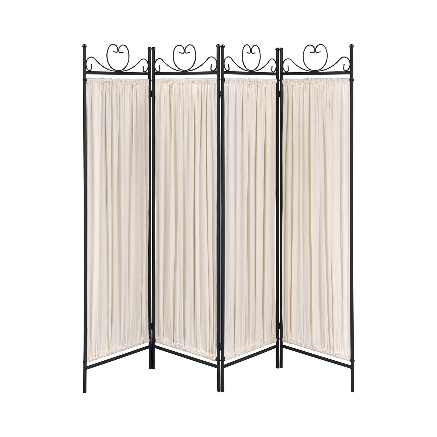 Give yourself privacy with this four-panel screen. Ideal for making one study room into two. Alternatively, it can soften sunlight in a bright living room or keep things private. Simple black metal supports frame the attractive beige fabric. Scroll work heart-like design on top imparts a touch of elegance.